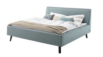 Mit den eichefarbenen Holzfüßen und dem eisblauen Flachgewebebezug bringt das Polsterbettgestell Mattis maritimes Flair in Ihr Schlafzimmer.