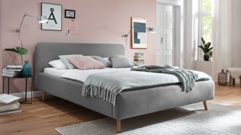 Die warme Farbe der Füße kontrastiert mit dem kühlen Ton des Bezugs - und doch harmonieren die beiden Nuancen hervorragend und verführen zu Traumreisen - beziehungsweise Reiseträumen - in natürliche Gefilde wie ein Gebirge mit schönen Bäumen. Ein weiteres Highlight des rundum überzeugenden Bettgestells bildet das glatt bezogene Polsterkopfteil. Dieses ermöglicht durch die weiche Haptik auch entspannt angelehntes Sitzen, etwa abends beim Lesen vor dem Schlafen oder morgens beim Blick aus dem Fenster zum Wachwerden.