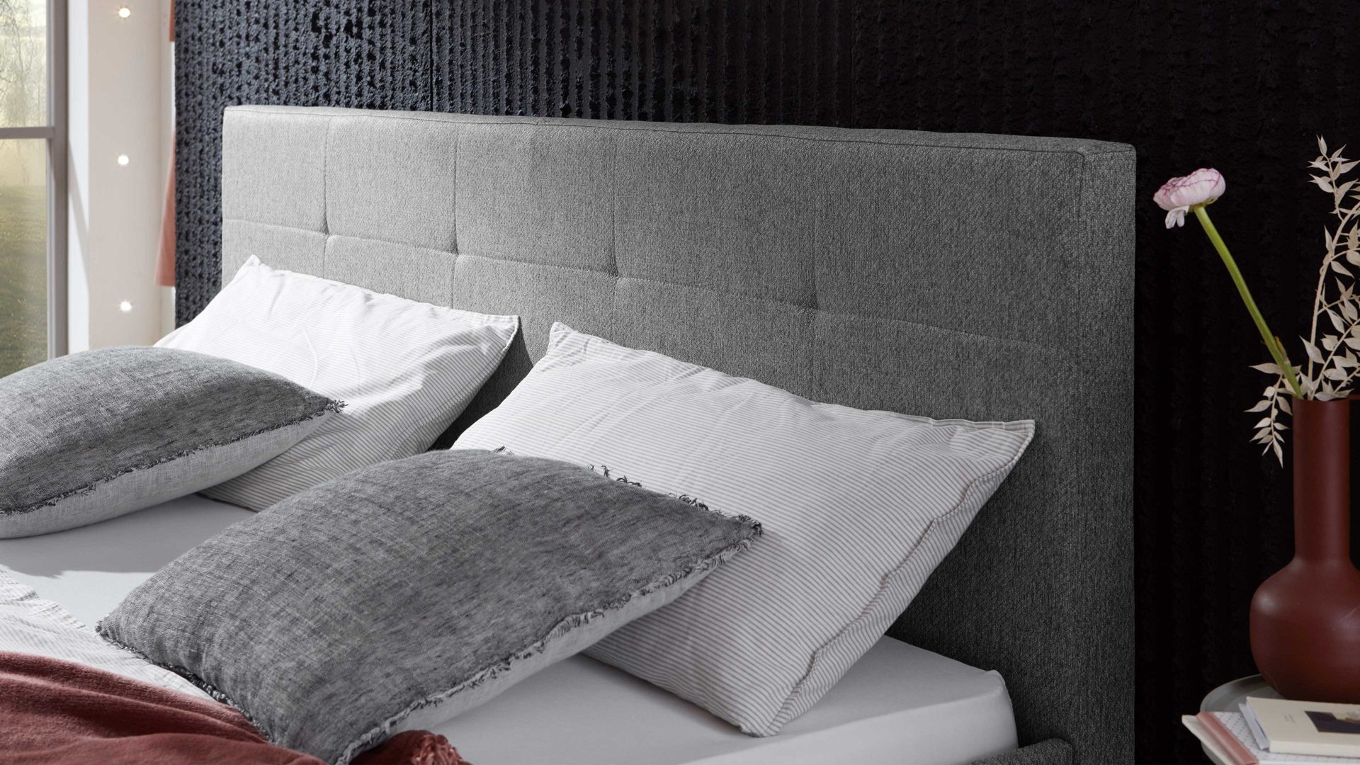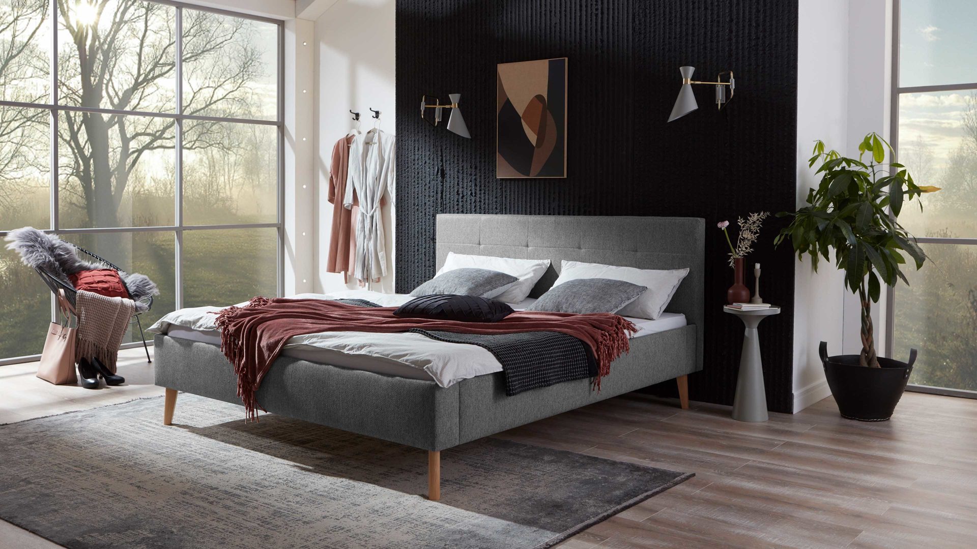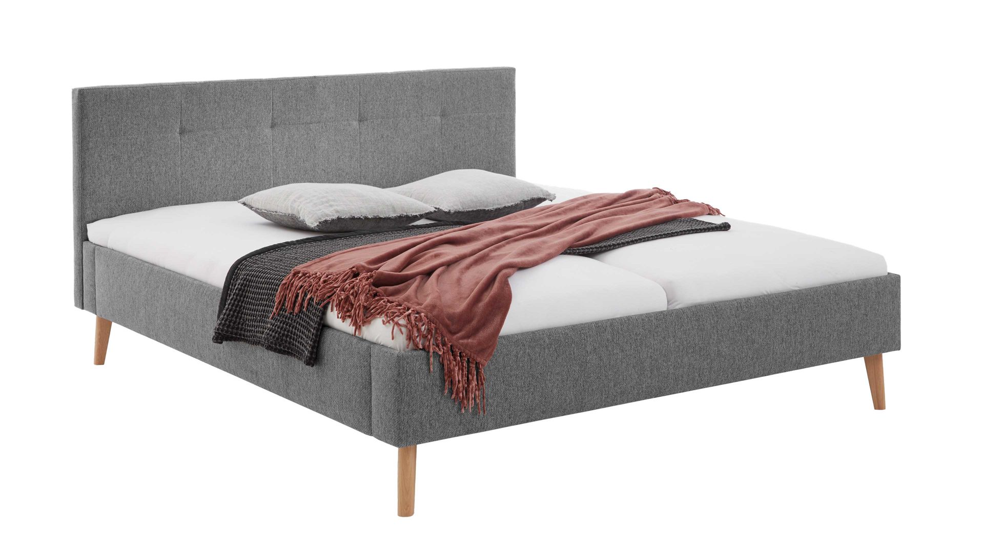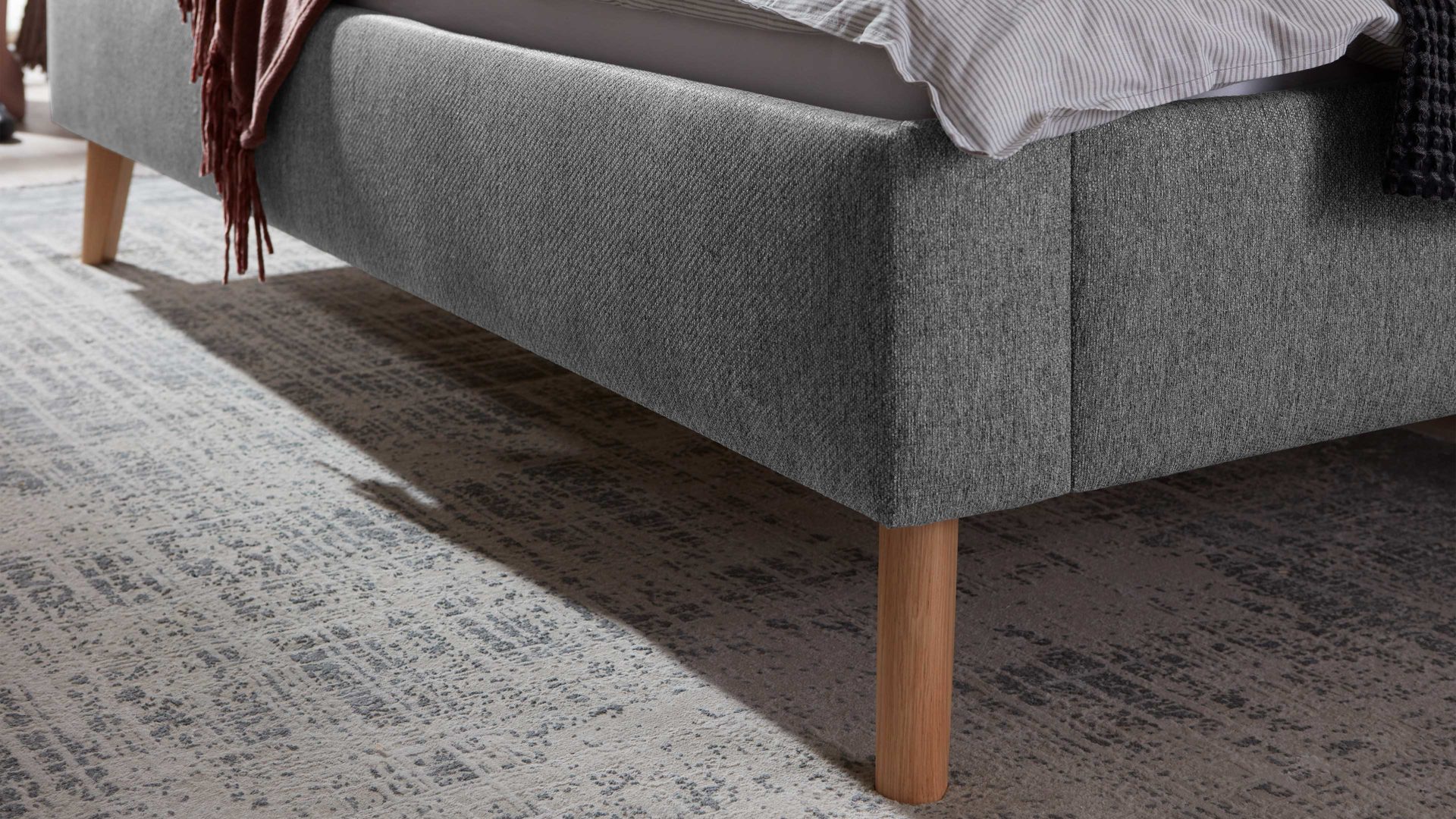 Das Polsterbettgestell Jazz ist gemütlich und stilvoll designt. Mit dem edlen grauen Stoffbezug und den eichefarbenen Holzfüßen strahlt es Eleganz mit einer Prise Natürlichkeit aus. Zu den Höhepunkten gehört das gesteppte Polsterkopfteil. Es verleiht dem Bett das gewisse optische Etwas und gibt Ihnen beim Lesen oder Fernsehen eine bequeme Anlehnmöglichkeit. Die Bettseiten sind glatt bezogen.