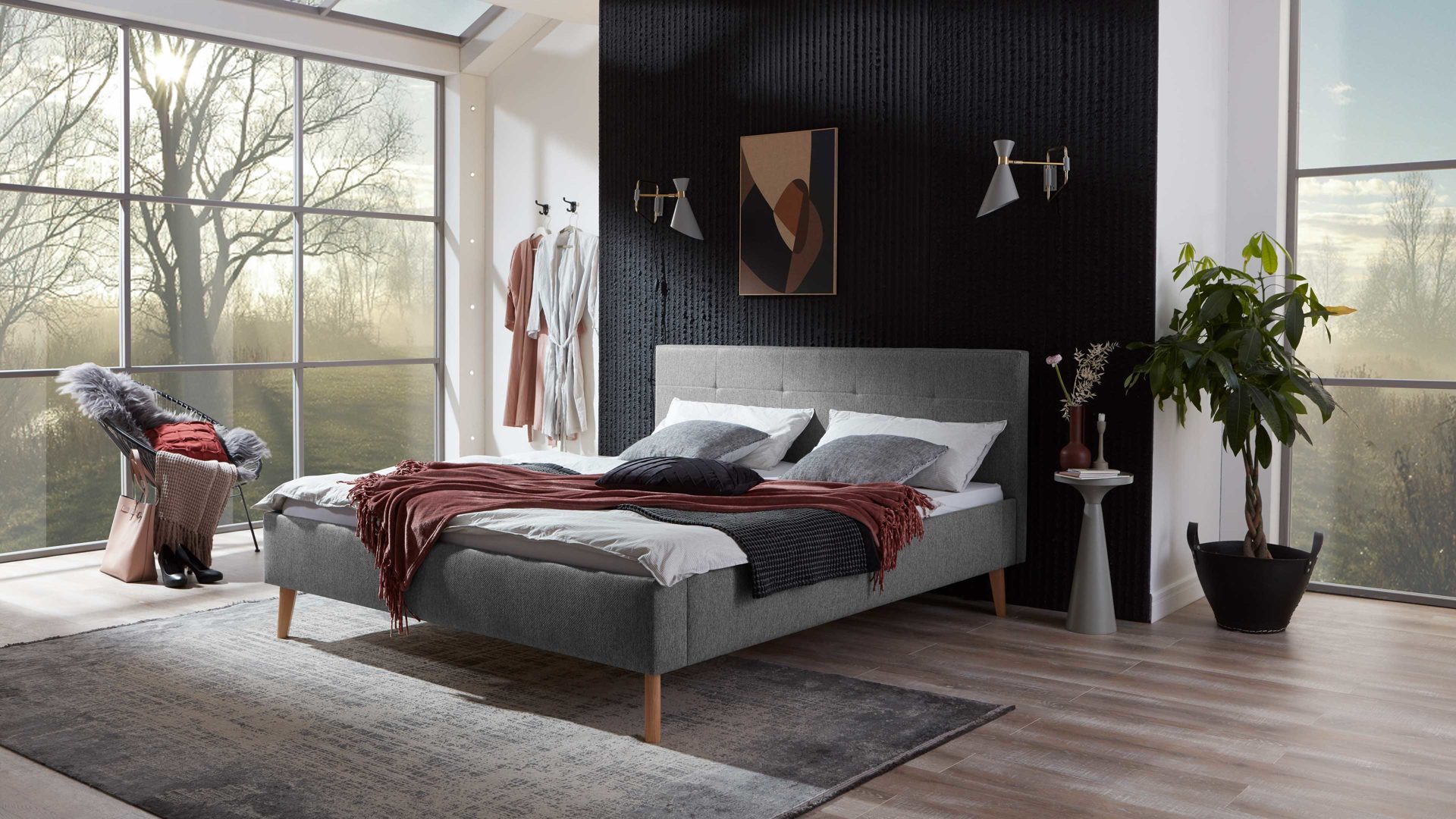 Das Polsterbettgestell Jazz ist gemütlich und stilvoll designt. Mit dem edlen grauen Stoffbezug und den eichefarbenen Holzfüßen strahlt es Eleganz mit einer Prise Natürlichkeit aus. Zu den Höhepunkten gehört das gesteppte Polsterkopfteil. Es verleiht dem Bett das gewisse optische Etwas und gibt Ihnen beim Lesen oder Fernsehen eine bequeme Anlehnmöglichkeit. Die Bettseiten sind glatt bezogen.