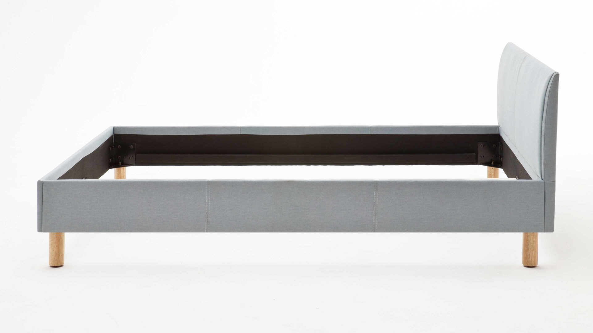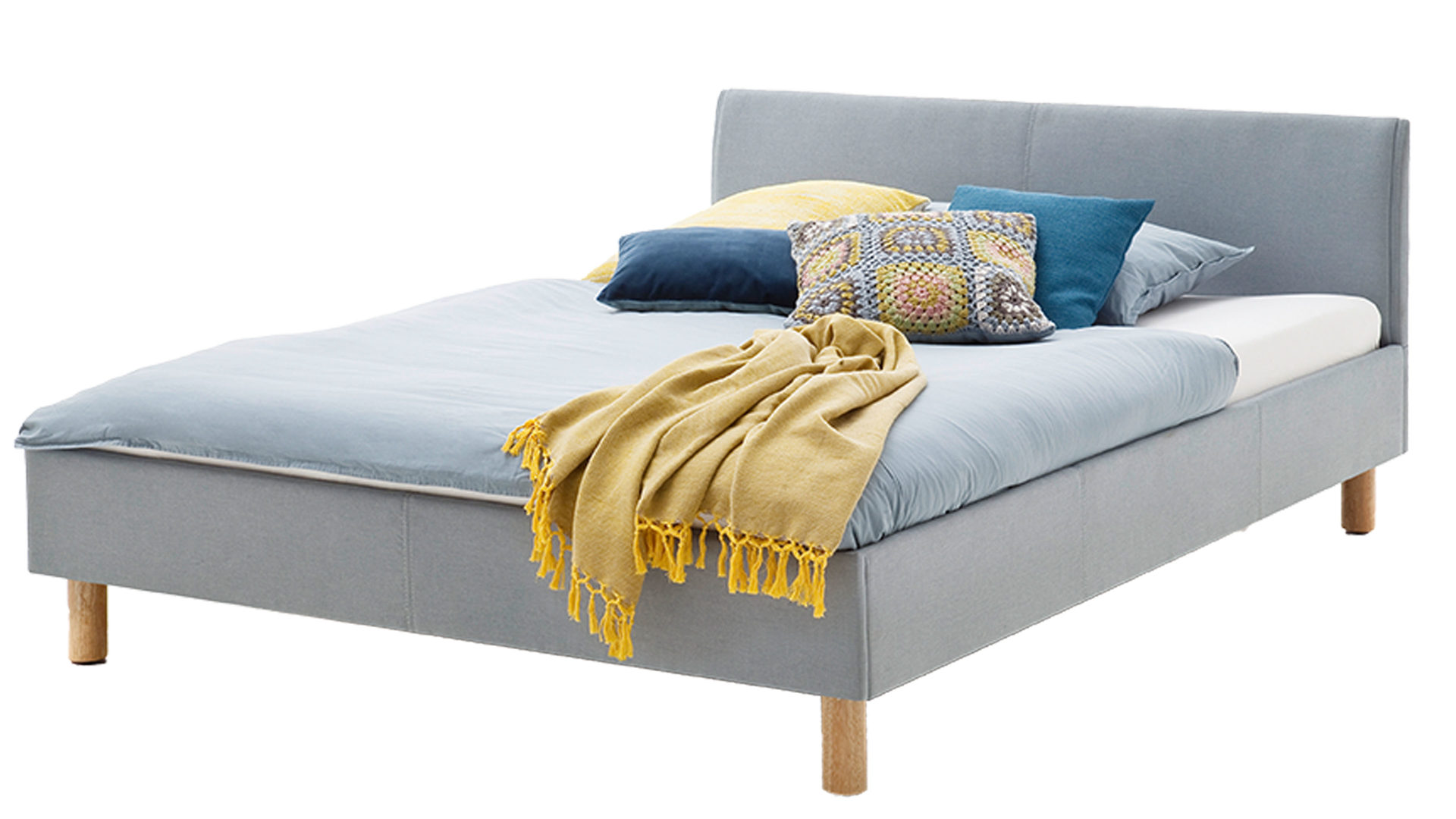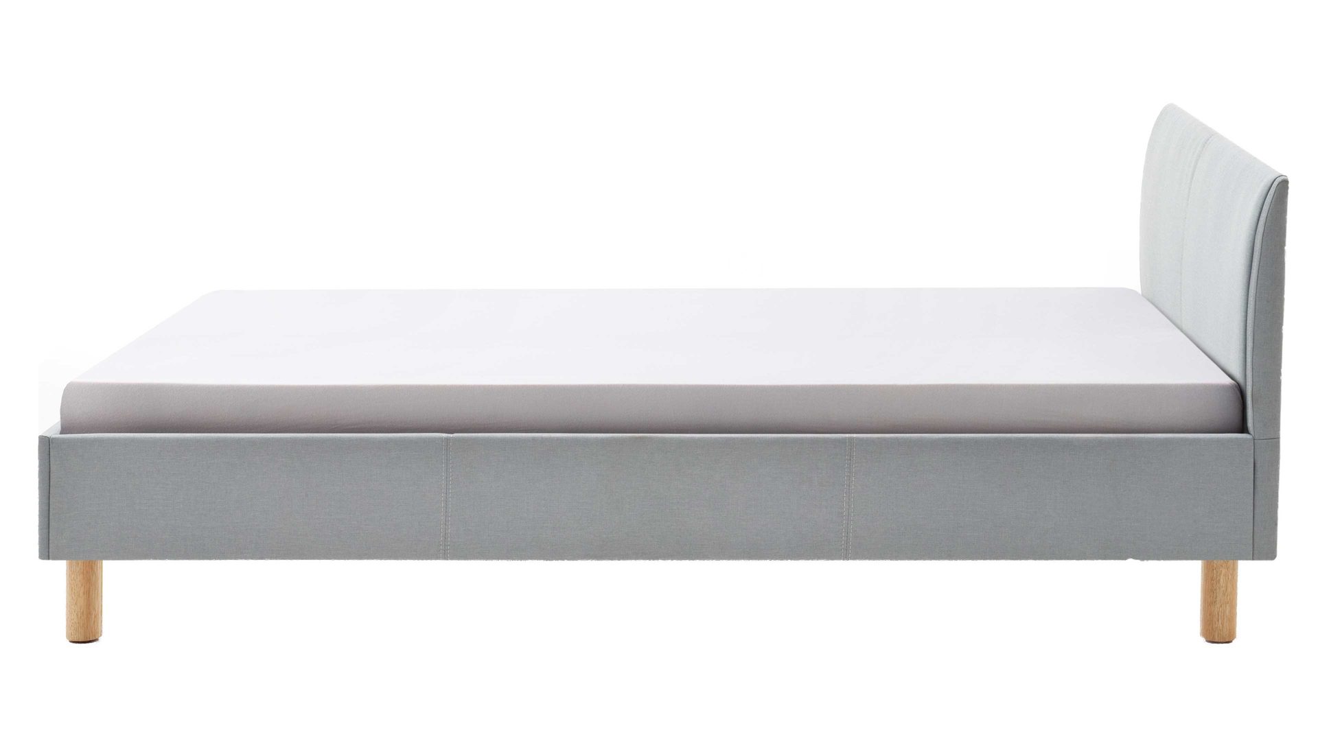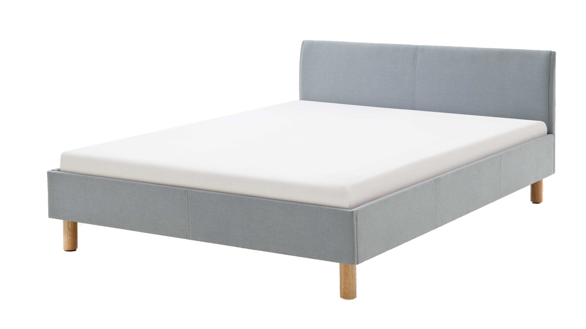 Mit dem edlen eisblauen Stoffbezug und den eichefarbenen Holzfüßen strahlt das Polsterbettgestell Lena frische Eleganz mit einer Prise Natürlichkeit aus. Sowohl die Bettseiten als auch das bequeme Polsterkopfteil sind glatt bezogen, was den gemütlichen Charakter des Bettes unterstreicht. Das angenehm weiche Kopfteil ist beispielsweise beim Lesen oder Fernsehen als praktische Rückenlehne nutzbar.