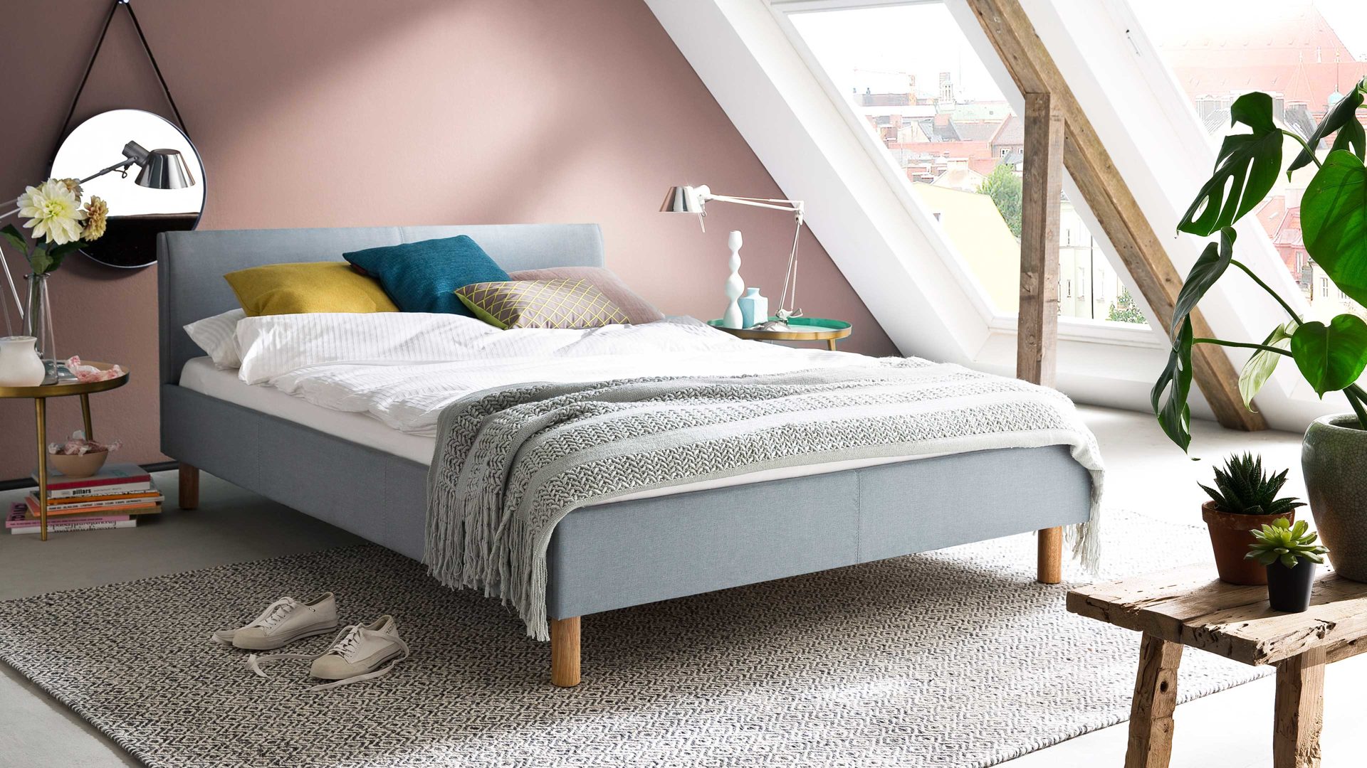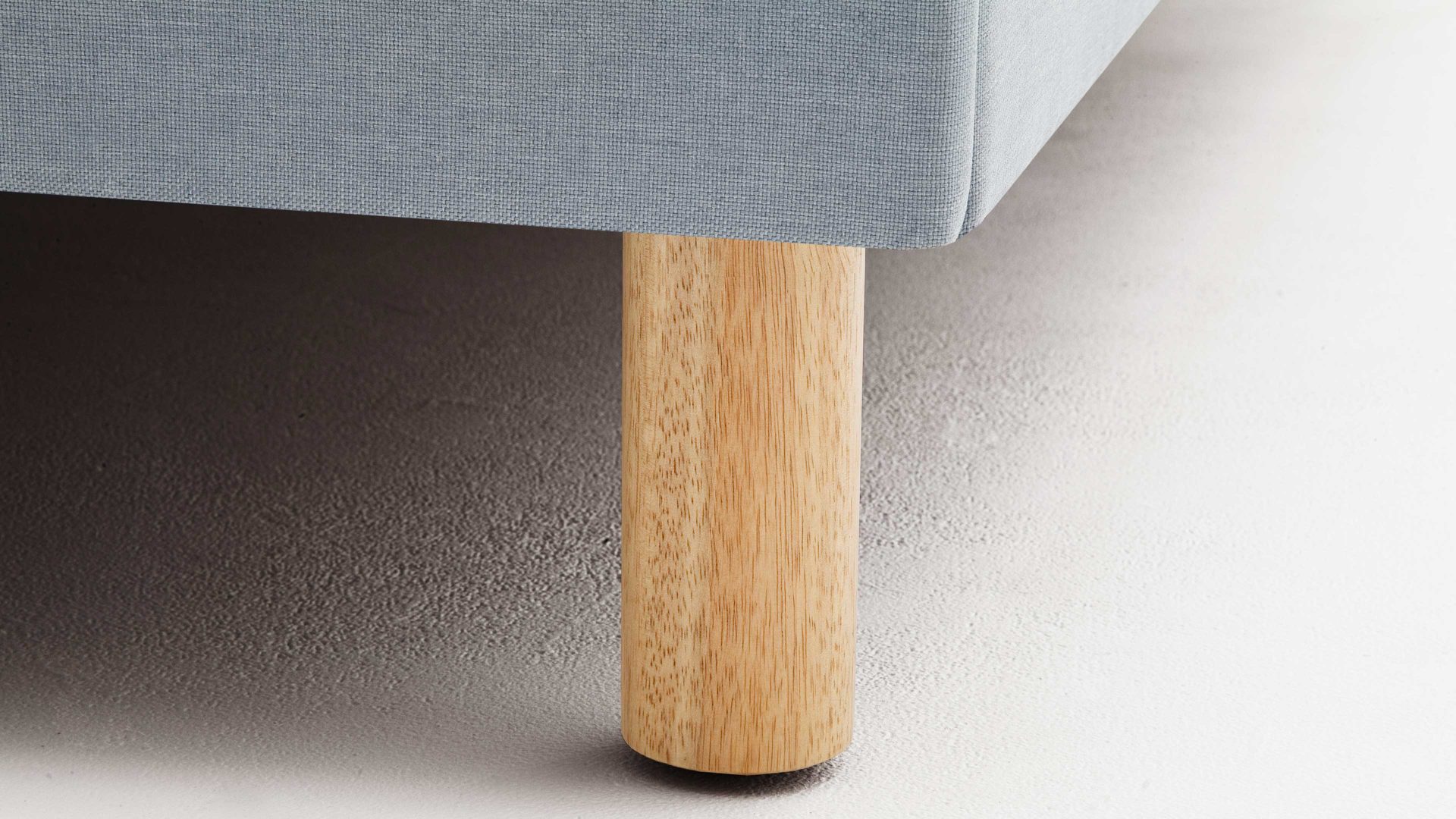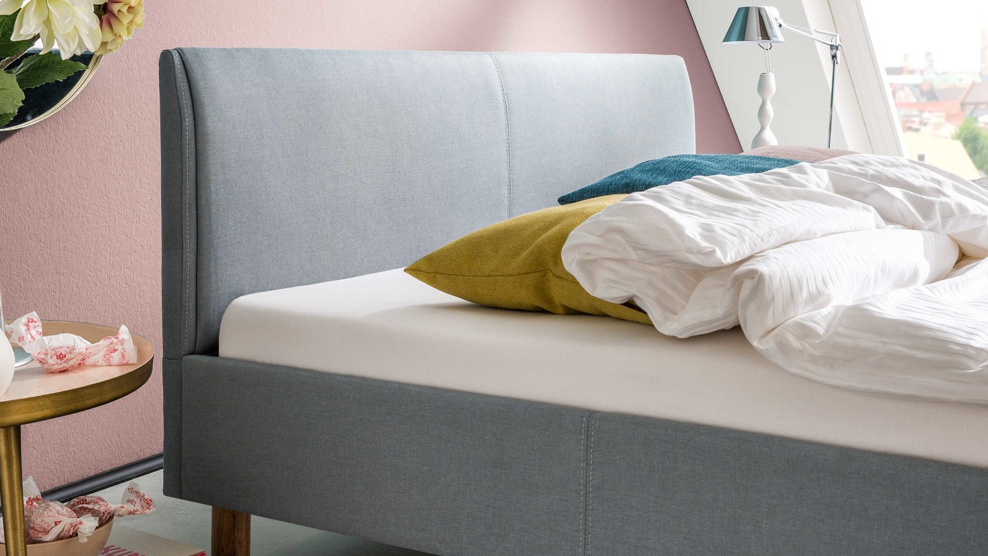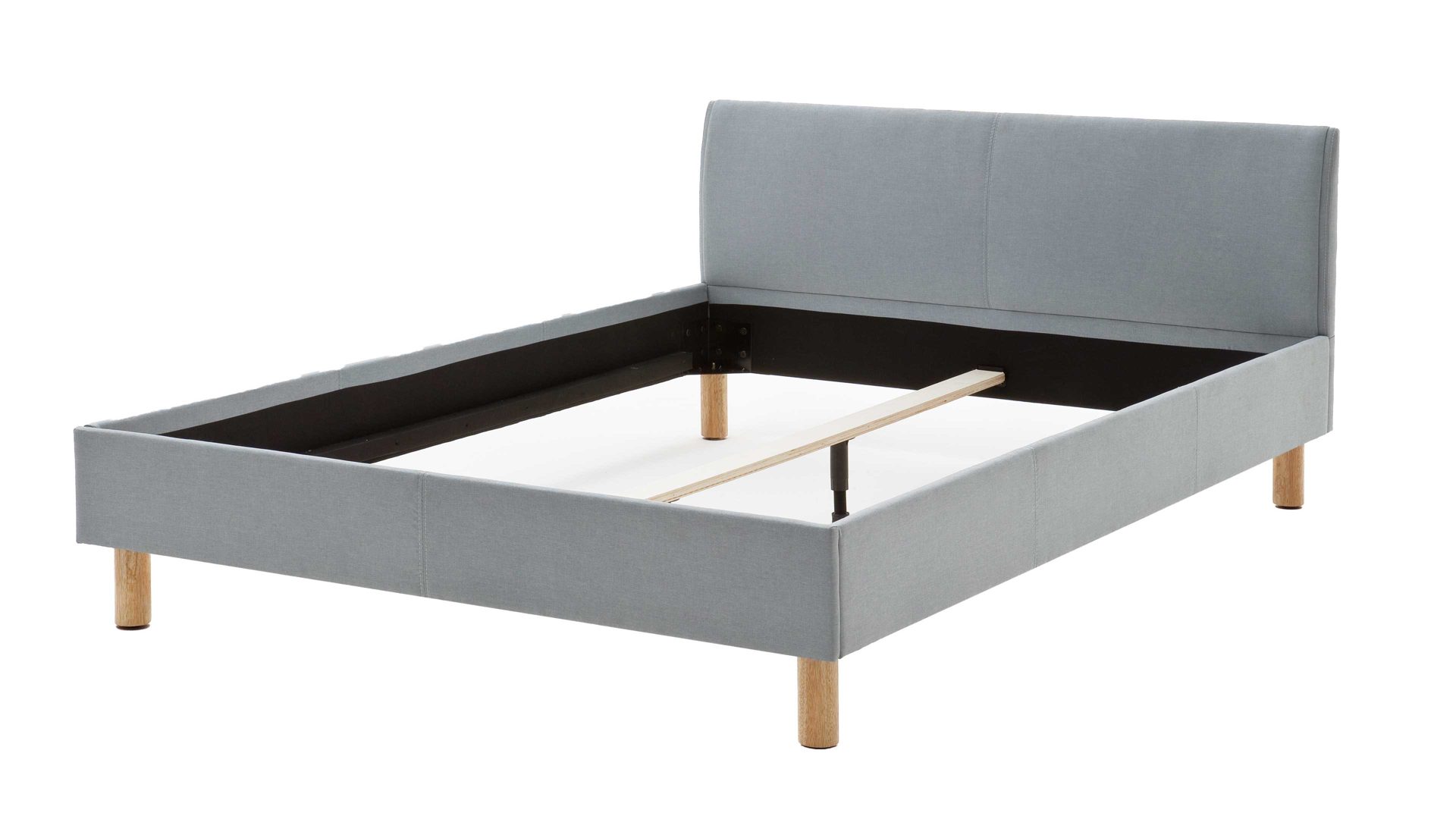Mit dem edlen eisblauen Stoffbezug und den eichefarbenen Holzfüßen strahlt das Polsterbettgestell Lena frische Eleganz mit einer Prise Natürlichkeit aus. Sowohl die Bettseiten als auch das bequeme Polsterkopfteil sind glatt bezogen, was den gemütlichen Charakter des Bettes unterstreicht. Das angenehm weiche Kopfteil ist beispielsweise beim Lesen oder Fernsehen als praktische Rückenlehne nutzbar.