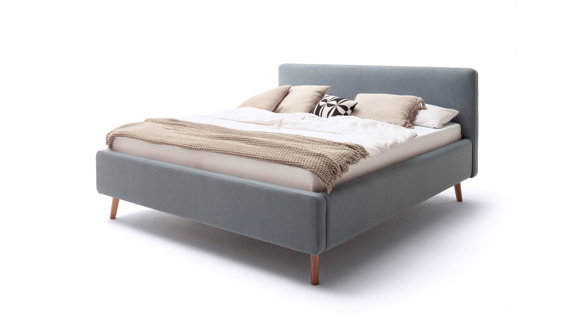 Das Polsterbettgestell Mattis begeistert durch die elegante Optik sowie die hervorragende Material- und Verarbeitungsqualität. Es kombiniert einen eisblauen Flachgewebe-Bezug mit eichefarbenen Holzfüßen. Sowohl die Bettseiten als auch das Polsterkopfteil sind glatt bezogen. Letzteres lädt Sie ein, sich anzulehnen, wenn Sie abends im Bett vor dem Schlafen noch fernsehen oder in einem Buch lesen.
