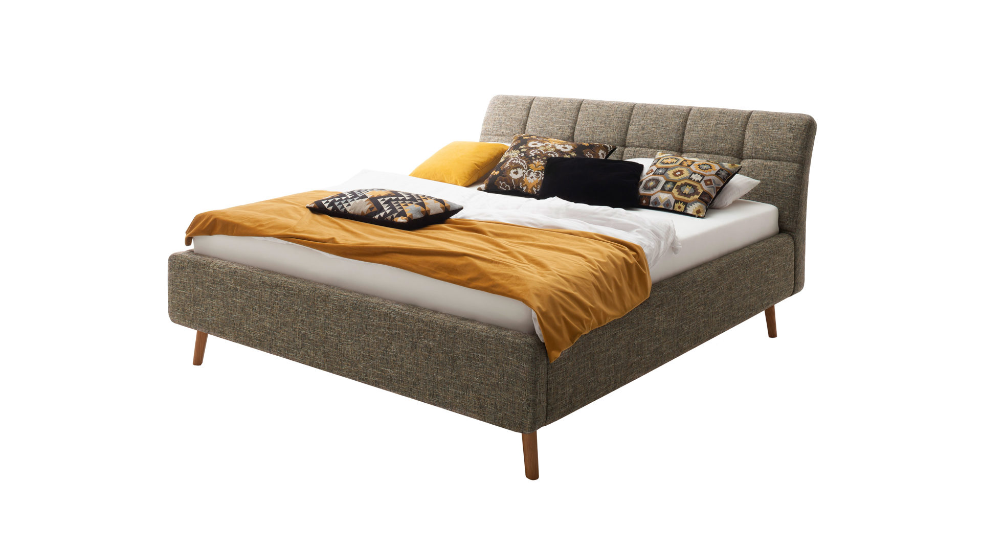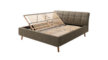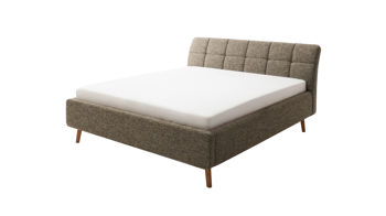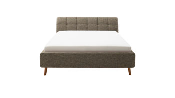 Pure Eleganz bringt das Polsterbettgestell Mila in Ihr Schlafzimmer. Die eichefarbenen Füße wirken filigran und verleihen diesem Modell eine luftig leichte Ausstrahlung. Ausgestattet ist das schicke Bett mit dem braunen Strukturbezug Building 801.