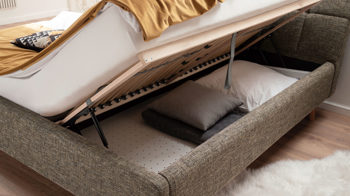 Im Inneren liegen zwei jeweils seitlich zu öffnende Federholzrahmen mit 28 starren Leisten. Dank der möglichen Härtegradverstellung liegen Sie immer genau richtig. Der integrierte Bettkasten ist belüftet und geteilt - für eine Extramaß an Ordnung und Stauraum bei dennoch optimaler Luftzirkulation.