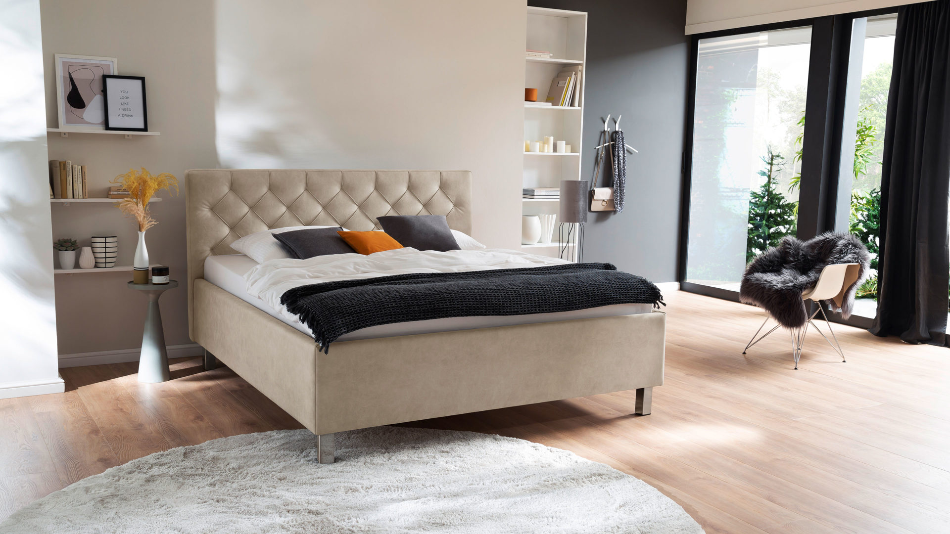 Das Polsterbettgestell San Remo bringt einen zeitlosen Chic mit. Sein beiger Mikrofaserbezug Bulus 02 trifft auf Metallfüße in einem hellen Chrom-Ton. Abgerundet wird das edle Design von dem gesteppten Kopfteil mit Rautenmuster. Es entsteht ein stilvoller Look voll frischer Eleganz.
