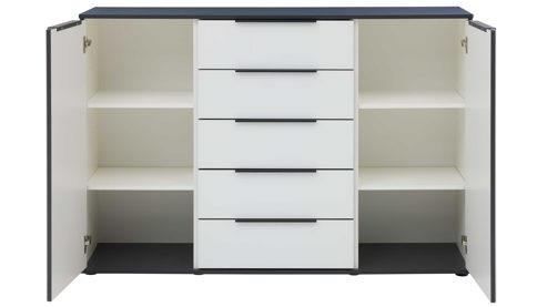Mit Maßen von ca. 151 x 102 x 46 cm (B/LxHxT) bietet die Superkombikommode großzügigen Stauraum für Kleidung, Wäsche und Accessoires. Die fünf Schubladen sind mit Vollauszug und Softeinzug ausgestattet, was für leises, komfortables Schließen sorgt. Hinter den zwei Türen befinden sich jeweils zwei höhenverstellbare Holzböden, die eine flexible Innenaufteilung ermöglichen – ideal für individuelle Ordnungssysteme.