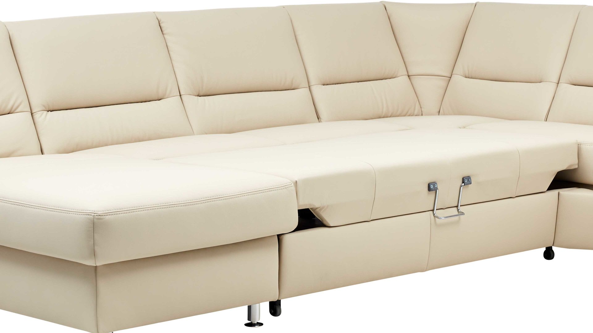 Indem Sie den Sitz am verchromten Metallgriff nach vorne und oben ausziehen, entsteht eine mit Matratzendrell bezogene Liegefläche, die um ca. 100 x 122 cm (BxL) größer ist als die Sitzfläche der jeweiligen Couch. Gegen Mehrpreis lässt sie sich auch im Originalstoff realisieren. Dank der Schlaffunktion können Sie Gästen stets eine komfortable Übernachtungsstätte offerieren. Im Handumdrehen verwandeln Sie das Sofa in ein gemütliches Gästebett - und wieder zurück.