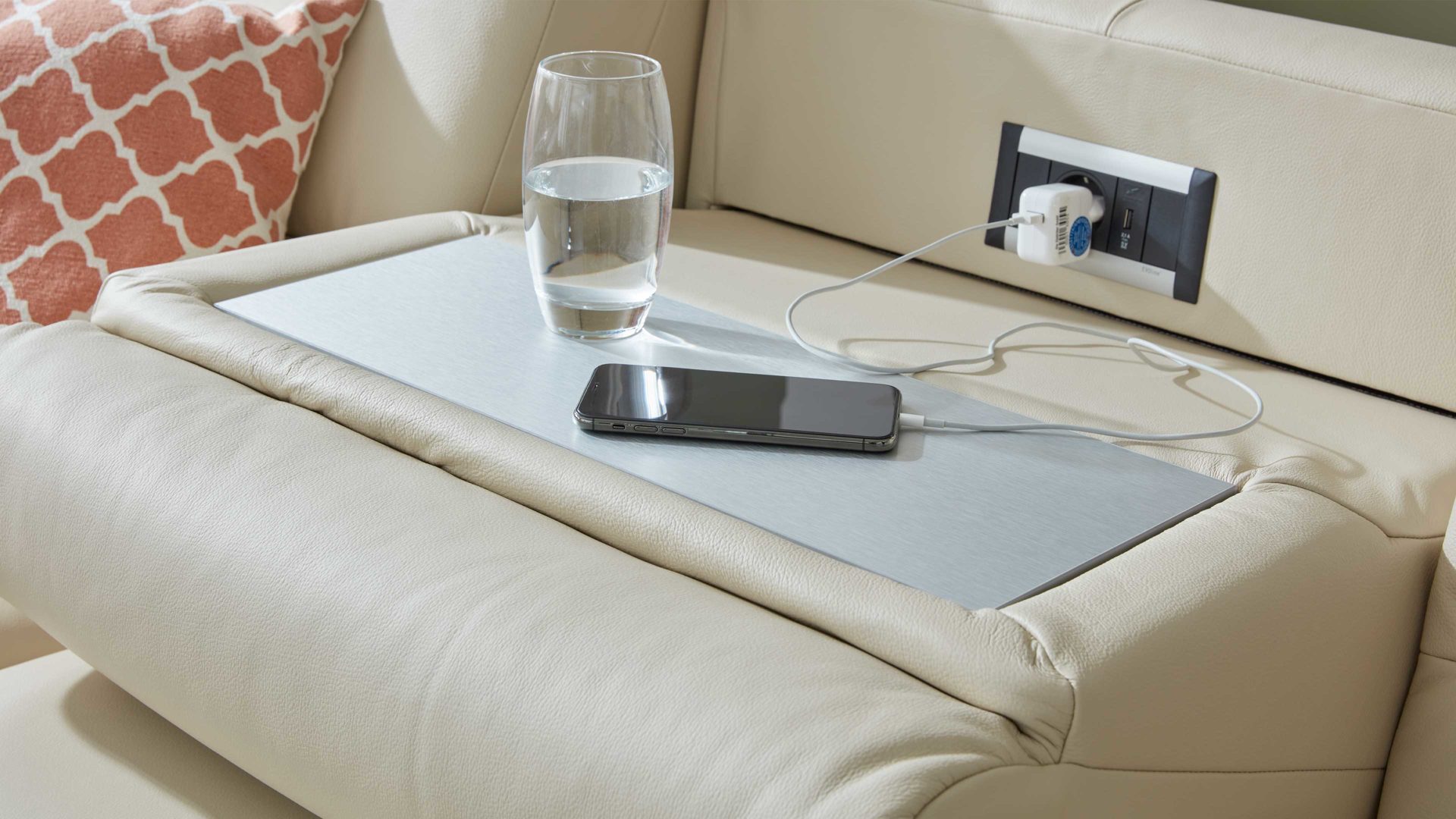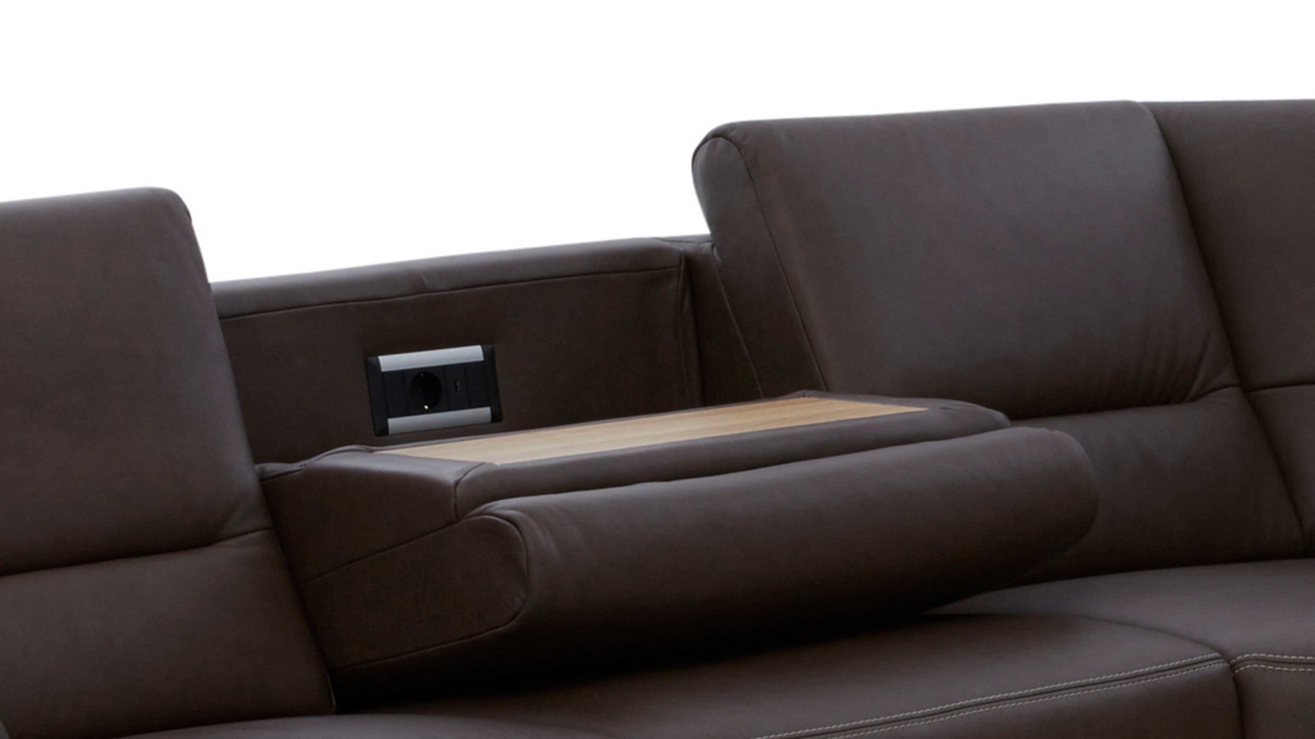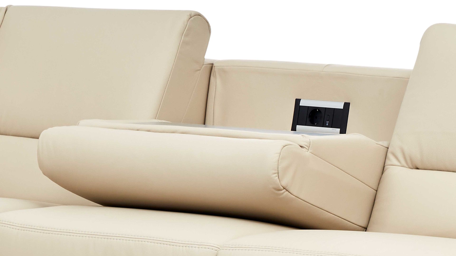 Indem Sie das Rückenpolster kurz mit einem Handgriff nach vorne klappen, offenbaren Sie eine praktische Ablagefläche, auf der Sie etwa bei einem Filmabend Gläser und Snacks platzieren können. Die Ablageplatte wird stets an den Farbton der Couchfüße angepasst. Als zusätzliches Highlight sind in den Rückenteil des Sofas Funktionsbuchsen - genauer gesagt eine Steckdose und ein USB-Anschluss - integriert. Somit können Sie hier auch bequem Ihr Mobiltelefon aufladen oder Ihr Notebook anschließen.
