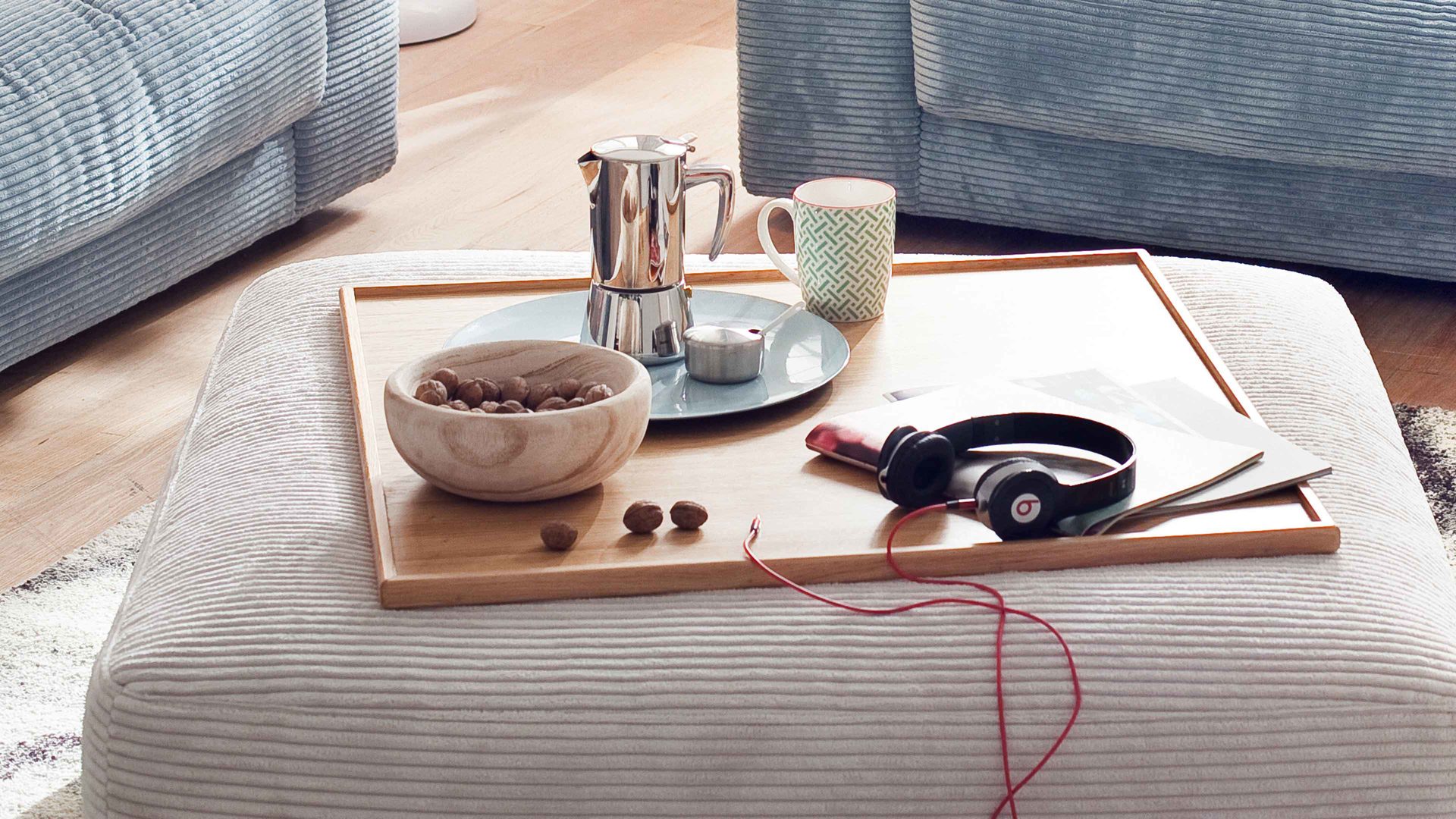 Das Hocker-Tablett ist ein nützliches Zubehör für den Polsterhocker aus dem Polsterprogramm SOFAkultur Seventies.