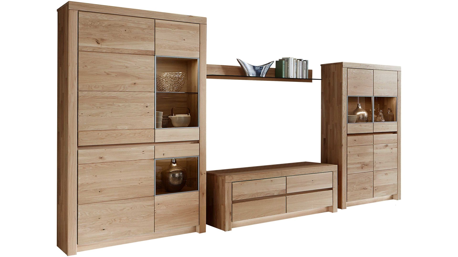 einer Kombi-Vitrine mit zwei Glaseinsätzen, einem Wandboard, einem TV-Unterschrank und einer Kombi-Vitrine mit einem Glaseinsatz.