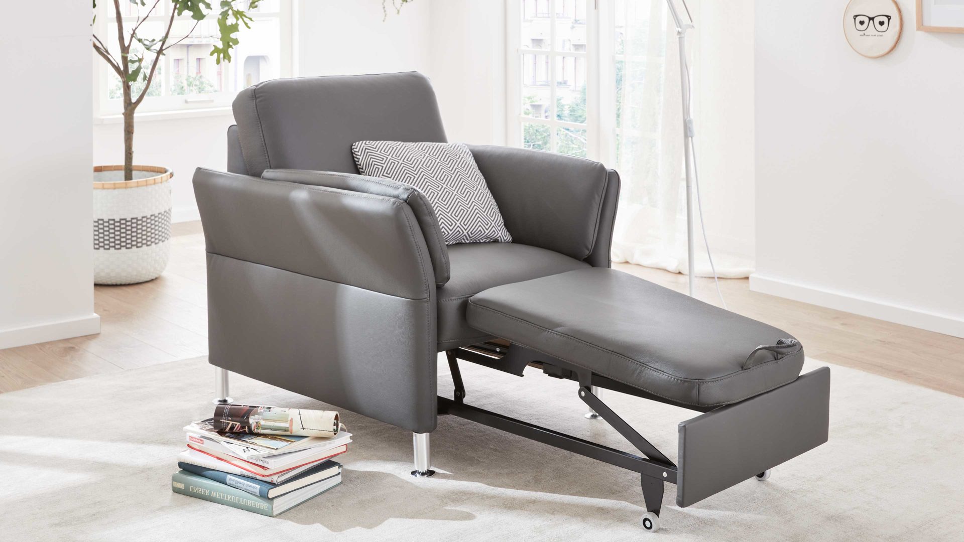 Der Modulmaster Sessel 1Ho aus der Serie MM-PN1080 kombiniert schlichte alufarbene Metallfüße mit einem anthrazitfarben pigmentieretn Lederbezug. Er strahlt klassische Eleganz aus und bringt tiefgründiges Flair ins Wohnzimmer. Durch die erstklassigen, hervorragend verarbeiteten Materialien ist der modern designte Sessel robust und stabil, pflegeleicht und bei sorgsamer Behandlung besonders langlebig. Der pigmentierte Lederbezug ist pflegefreundlich und leicht zu reinigen.
