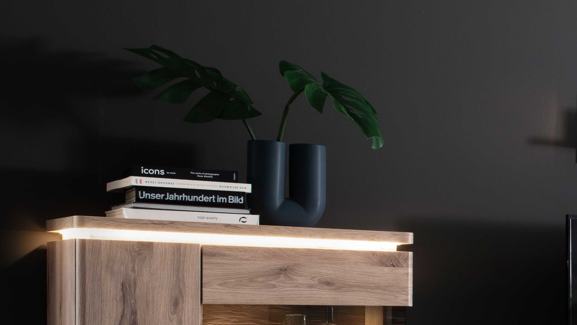 Viking Eiche-Nachbildung, kombiniert mit anthrazitfarbenen Melaminoberflächen
