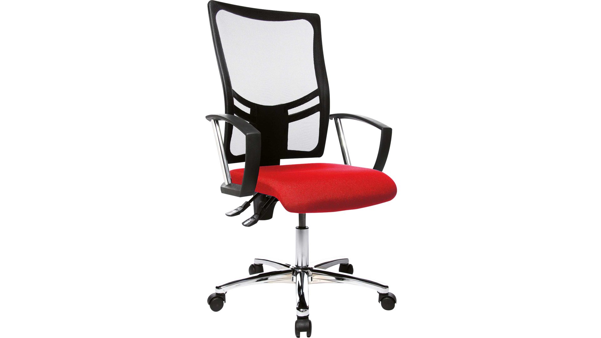 Das deutsche Qualitätsprodukt ist mit einem bequemen Flachsitz und der besonderen Toplift Sitzhöhenverstellung ausgestattet und passt sich dadurch optimal an jede Körpergröße an. Der dunkelrote Sitzbezug und das verchromte Stahlfusskreuz überzeugen durch moderne Optik.