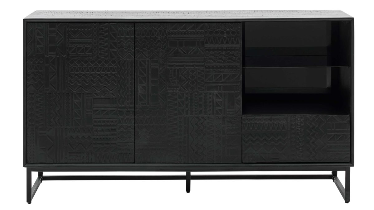 gebürstetes schwarz gebeiztes und lackiertes Mangoholz, kombiniert mit schwarz lackiertem MDF, Klarglas und schwarzem Metall