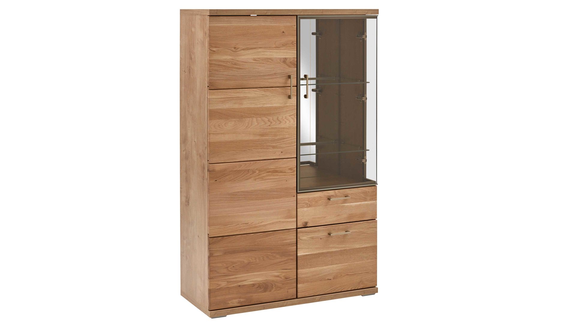 Die Vitrine umfasst eine Glastür mit einem Glaseinlegeboden im Inneren, zwei Holztüren und eine Schublade. Hinter dem Glas kommen Ihre schönsten Dekoelemente hervorragend zur Geltung. Die Maße der Einzelvitrine belaufen sich auf ca. 90 x 144 x 41 cm (BxHxT). Gegen Mehrpreis ist sie durch eine stimmungsvolle Beleuchtung akzentuierbar.