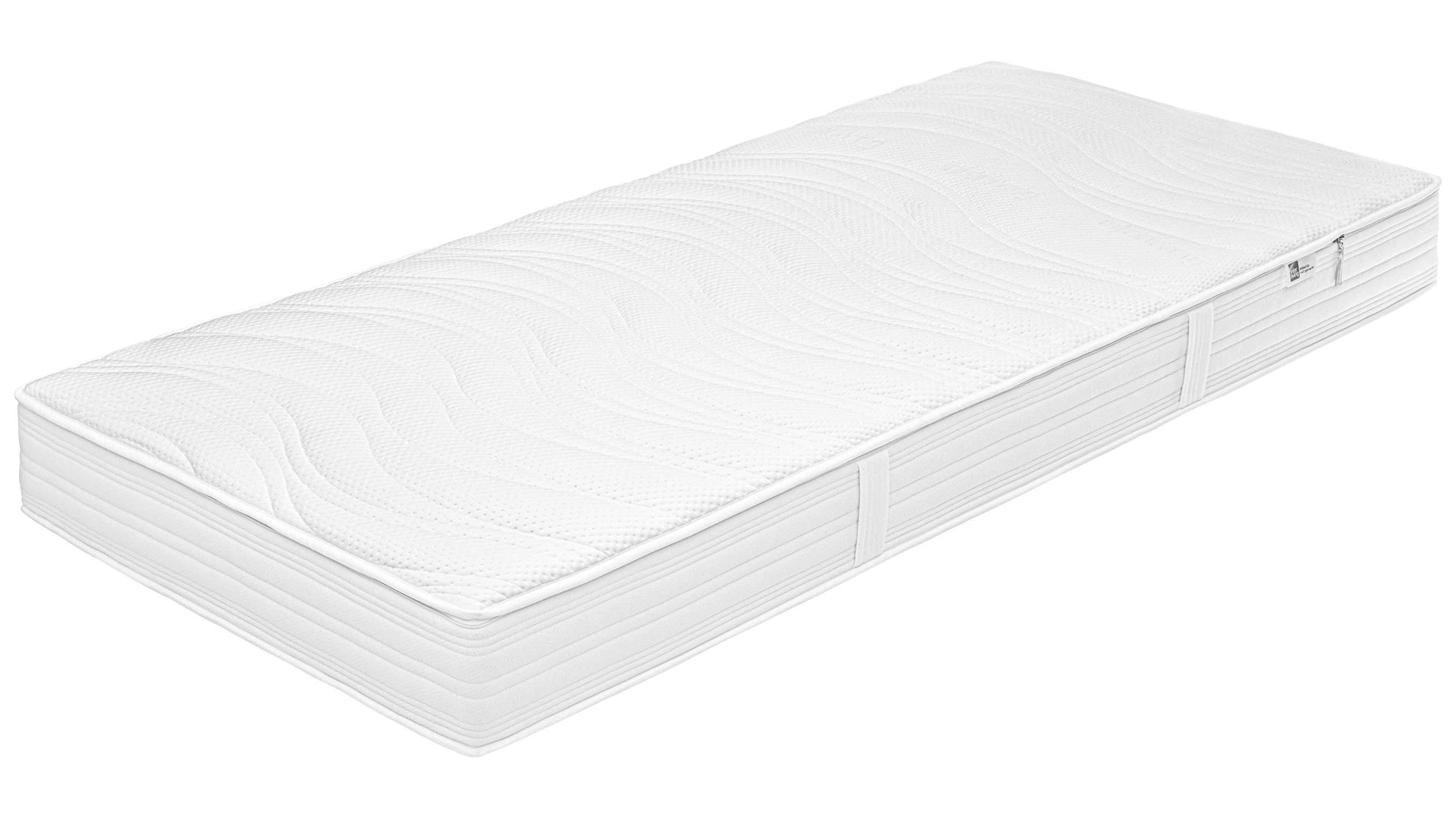 Im Inneren der Matratze arbeitet ein 7-Zonen-AQUAPUR®-Tonnentaschenfederkern mit einer Höhe von 12 cm und rund 440 Federn (bezogen auf 100 x 200 cm). Dieser reagiert punktgenau auf Druck und bietet eine gleichmäßige Stützkraft für jede Körperzone. Eine Verstärkung im Becken- und Lordosebereich durch eine Gittergewebseinlage sowie ein umlaufender Bandstahlrahmen erhöhen die Tragfähigkeit und Stabilität. Weiße Wollfilzabdeckungen und eine flächendeckende Faserverbundmatte stabilisieren die Konstruktion zusätzlich. Für noch mehr Festigkeit sorgt eine Gummi-Kokos-Pressflor-Matte, die gemeinsam mit der 3 cm starken AQUAPUR®-Schaumauflage für hohe Formstabilität und eine gleichmäßige Druckverteilung sorgt.