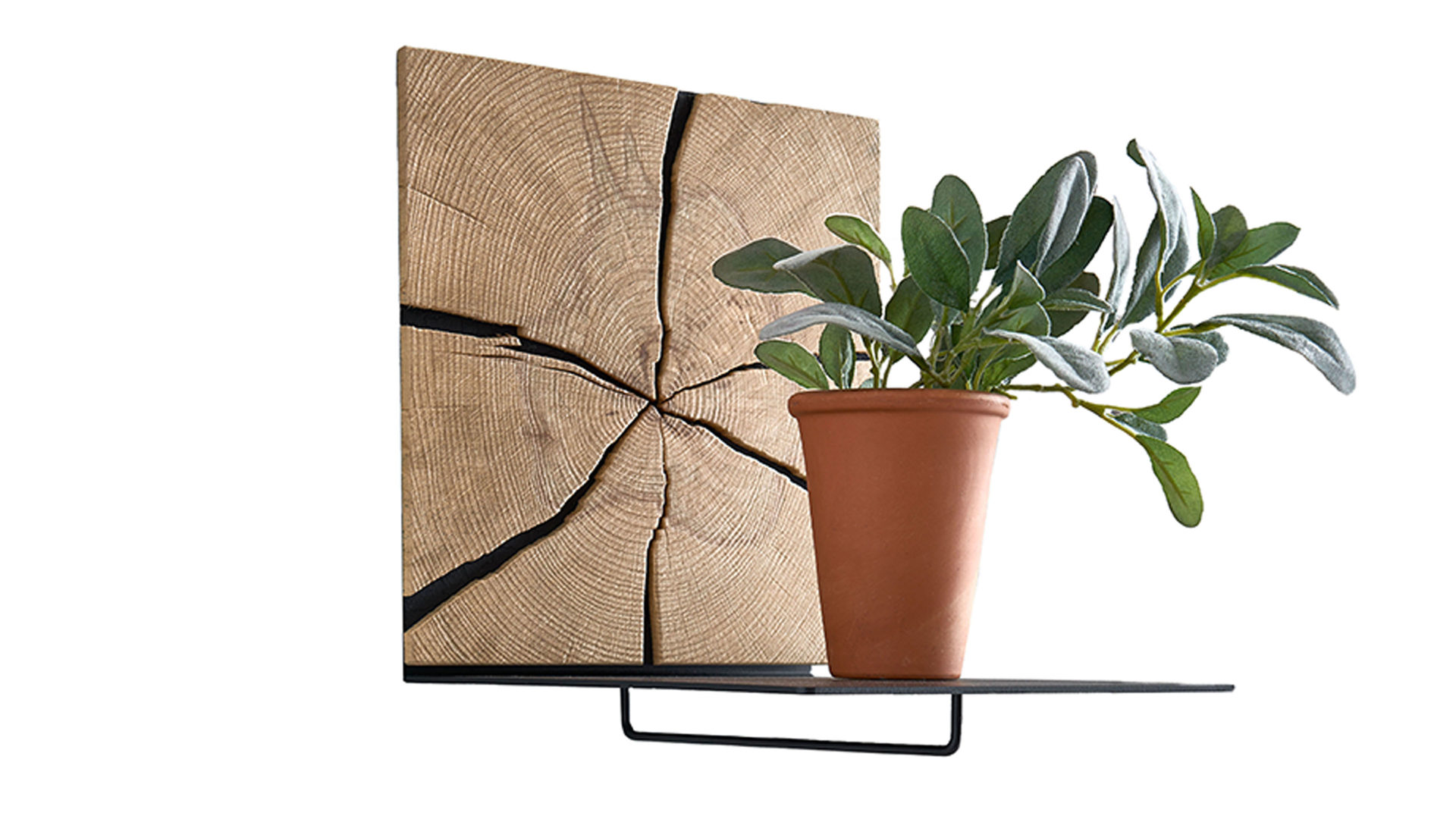 Die Wandablage Runa verbindet massive Kerneiche und anthrazitfarben pulverbeschichtetes Metall zu einem robusten, modernen und eindrucksvollen Ganzen.