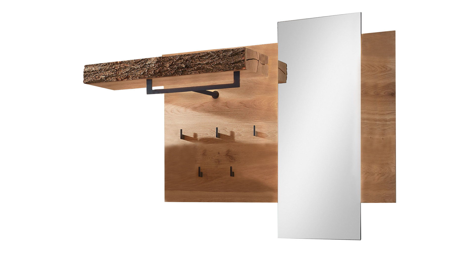 Die Wandgarderobe Runa verbindet massive Kerneiche, Rindenholz, hochwertiges Spiegelglas und anthrazitfarbenes Metall zu einem robusten, modernen und eindrucksvollen Ganzen.
