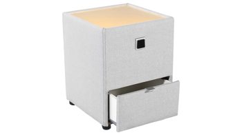 Als essentielles Aufbewahrungsmöbel besticht die Kommode in Ihrem Schlafraum mit einer geradlinigen Optik und praktischen Funktionen. Außergewöhnliche Haptik: Die Nachtkonsole ist mit einem hellgrauen Bezug rundum stoffbezogen und dadurch ein echter Hingucker. Auf dem Nachtschrank legen Sie beispielsweise ein Buch oder Ihre Lesebrille ab, während Sie in der einen Schublade weitere Utensilien wie Taschentücher oder Schmuck verstauen.