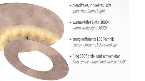 Eine klassische Deckenleuchte strahlt das Licht eher weitflächig in den Wohnraum – nicht so die Deckenlampe des Herstellers Paul Neuhaus. Die LED-Deckenleuchte Nevis begeistert mit einem indirekten Licht, das Sie individuell ausrichten. An der kreisrunden Deckenplatte mit einem Durchmesser von ca. 27 cm hängt ein kleiner Ring mit einem Durchmesser von ca. 17 cm. Für eine optimale Beleuchtung ist der Ring 360 Grad drehbar und schwenkbar.