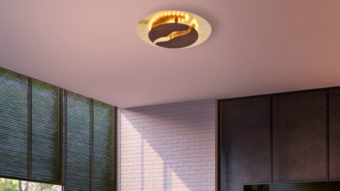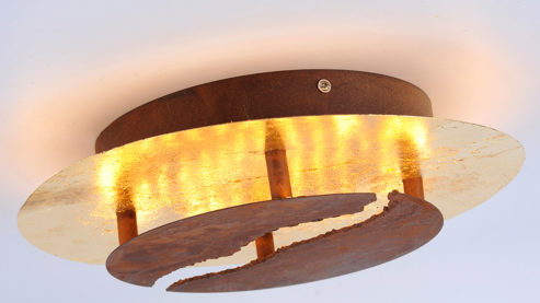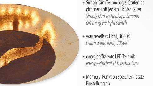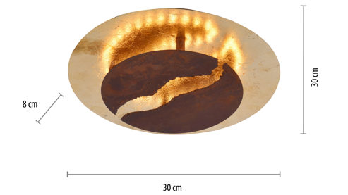 Der Sonne ist das Design der raffinierten Lampe, die aus goldfarbenem Metall mit Rostpatina besteht, nachempfunden. Wie hell die Leuchte in Ihren Wohnbereich scheint, entscheiden Sie selbst: Die Deckenlampe ist über einen Wandschalter stufenlos dimmbar. Mit einem Durchmesser von ca. 30 cm und einer Höhe von ca. 8 cm findet die schöne Leuchte unter jeder Zimmerdecke einen Platz.