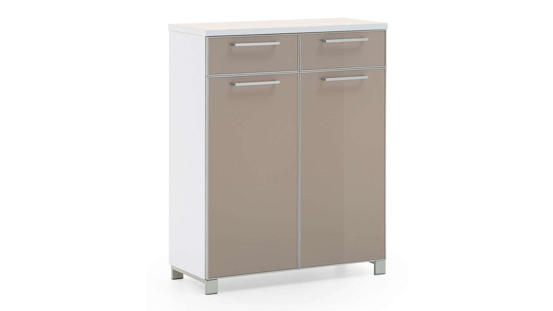 Der VOSS MÖBEL Schuhschrank Santina ist modern-elegant designt. Mit dem klassisch weiß lackierten Korpus und den taupefarbenen Glasfronten bringt er jede Menge Helligkeit in Ihren Flur. Edelstahlfarbene Griffe runden das noble Erscheinungsbild des optisch wie funktional ansprechenden Schuhkippers stilsicher ab.
