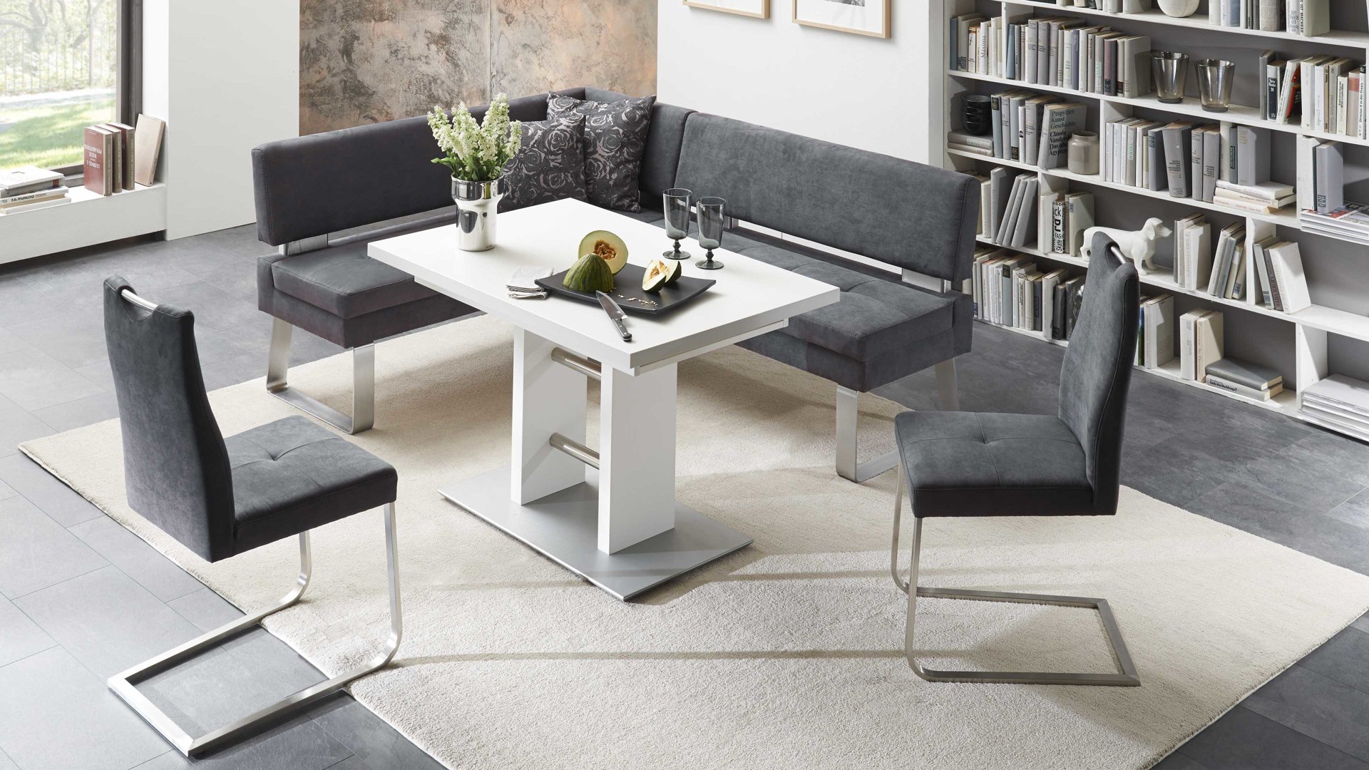 Der Auszugtisch Meran verbindet die Eleganz von Balkeneiche-Nachbildung mit Akzenten im edlen Farbton Anthrazit. Die beiden Töne harmonieren vorzüglich miteinander. Durch die Farben und den stilvollen Kontrast von Hell und Dunkel strahlt der Esstisch tiefgründig-natürlichen Charme aus, den er in Ihr Esszimmer überträgt.