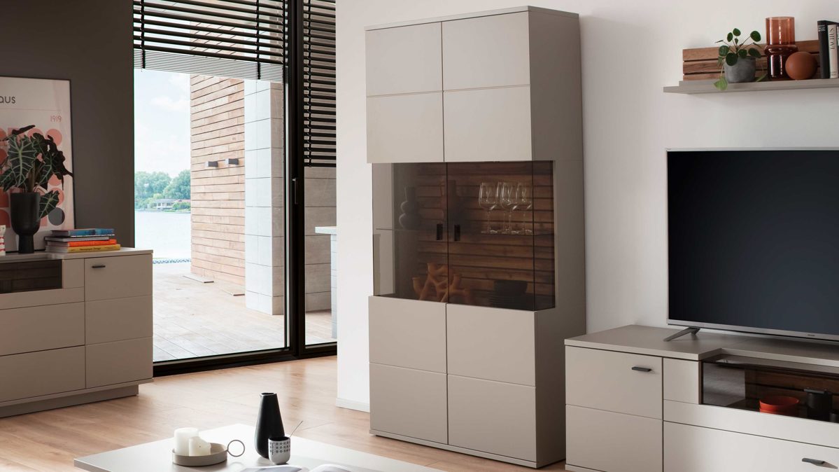 Vitrinenschrank mit pflegeleichten Melaminoberflächen