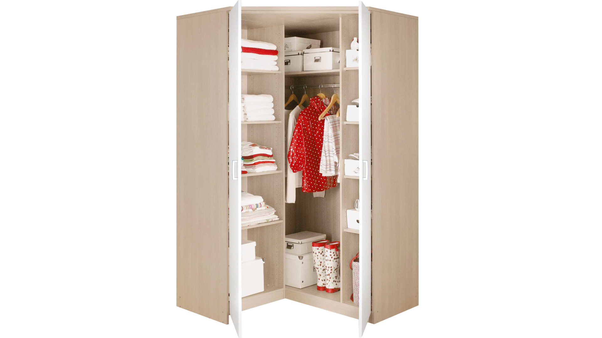 Der Kleiderschrank gibt Ihnen die Möglichkeit, auch die Ecken in Ihren Zimmern optimal auszunutzen. Mit insgesamt acht Regalböden und einer Kleiderstange bietet er reichlich Stauraum. Das Modell ist ca. 117 x 199 x 117 cm (BxHxT) groß. Dieser Kleiderschrank passt gut zu anderen Möbelstücken aus dem Schranksystem mit der Produktnummer 698201 - mit einem Klick zum ganzen Programm.