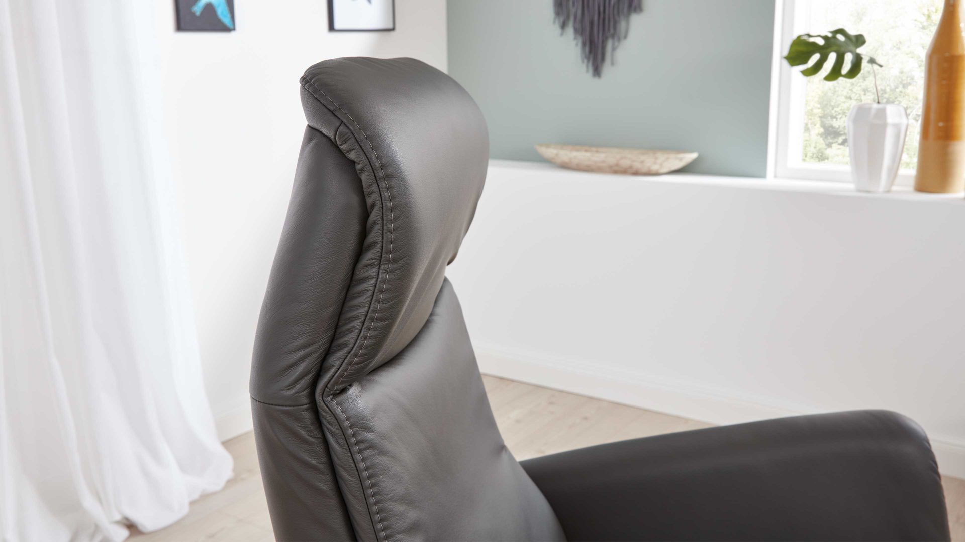 Der Modulmaster Relaxsessel MM-PN1062 ist exzellent verarbeitet und besonders stilvoll designt. Mit dem anthrazitfarben pigmentierten Glattlederbezug samt Ton-in-Ton-Kappnaht strahlt er moderne Eleganz aus. Für hohe Standfestigkeit sorgt der mattschwarze Aluminium-Sternfuß V1S, der die Optik zudem harmonisch abrundet.
