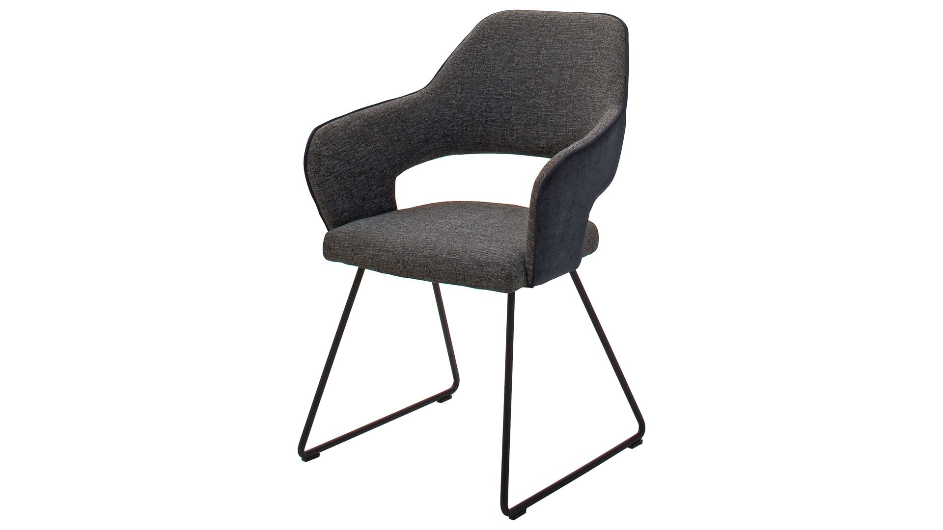 Als Basis fungiert ein anthrazitfarben lackiertes Kufengestell. Es gewährleistet die nötige Robustheit und Stabilität. Die Außenflächen sind mit holzkohlefarbenem Feingewebe, die Innenflächen mit Flachgewebe im Farbton Holzkohle bezogen. Durch die klassisch-elegante Farb- und Materialgestaltung lässt sich der Stuhl wunderbar mit den verschiedensten Einrichtungsstilen kombinieren.