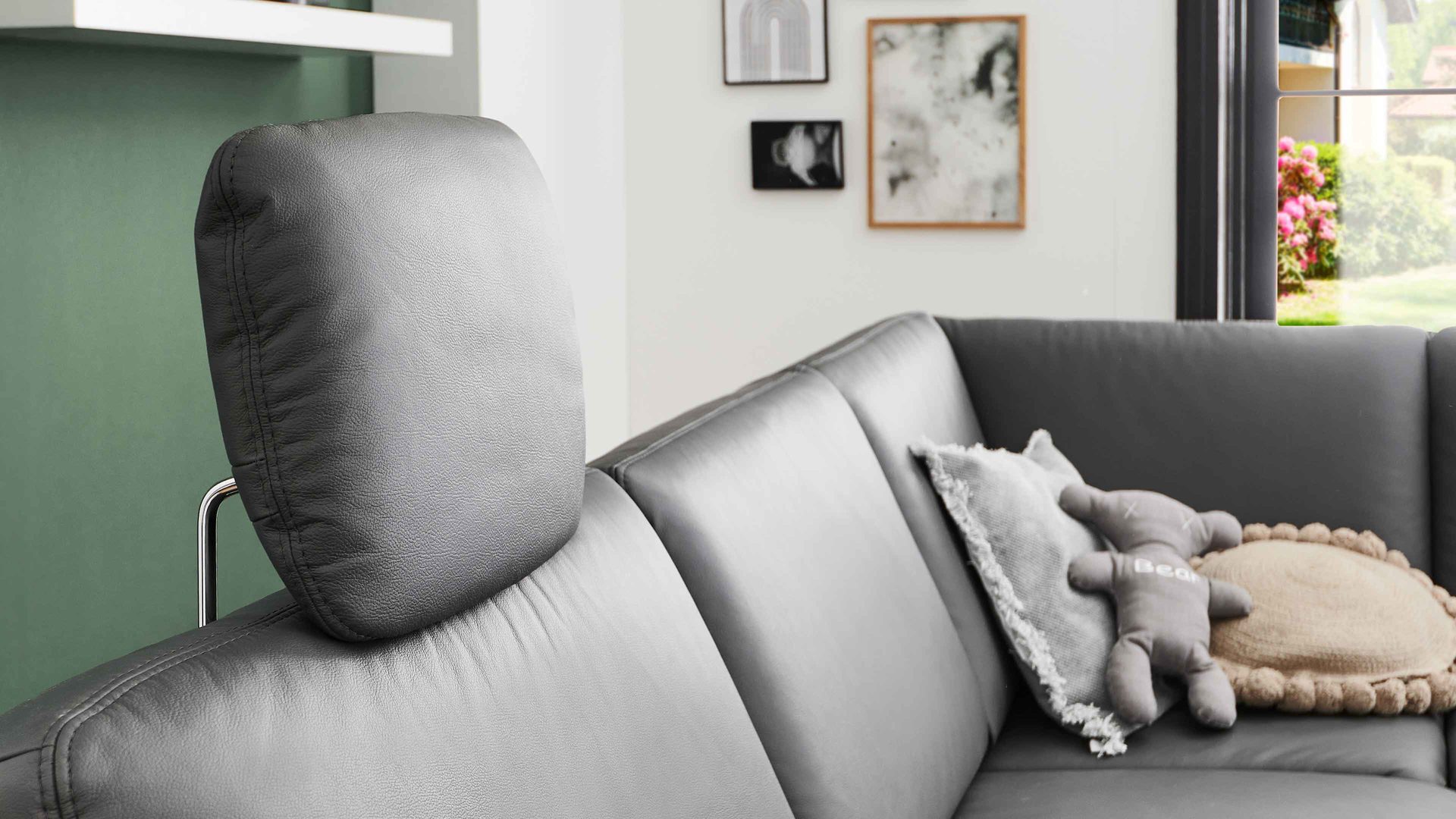 Die Comfort-Kopfstütze CKS fungiert als Mehrpreis-Zubehör für verschiedene Elemente aus dem Modulmaster-Polsterprogramm MM-PN1168. Sie ist mit anthrazitfarben pigmentiertem Glattleder bezogen und mit einer Kopfstützenvorrichtung aus verchromtem Metall ausgestattet.