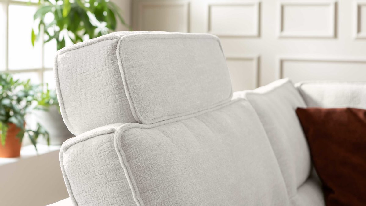 die Kopfstütze wird in die Kopfstützvorrichtung an der Rückenlehne des Sofas eingesteckt und lässt sich dann in der Höhe und in der Neigung manuell verstellen