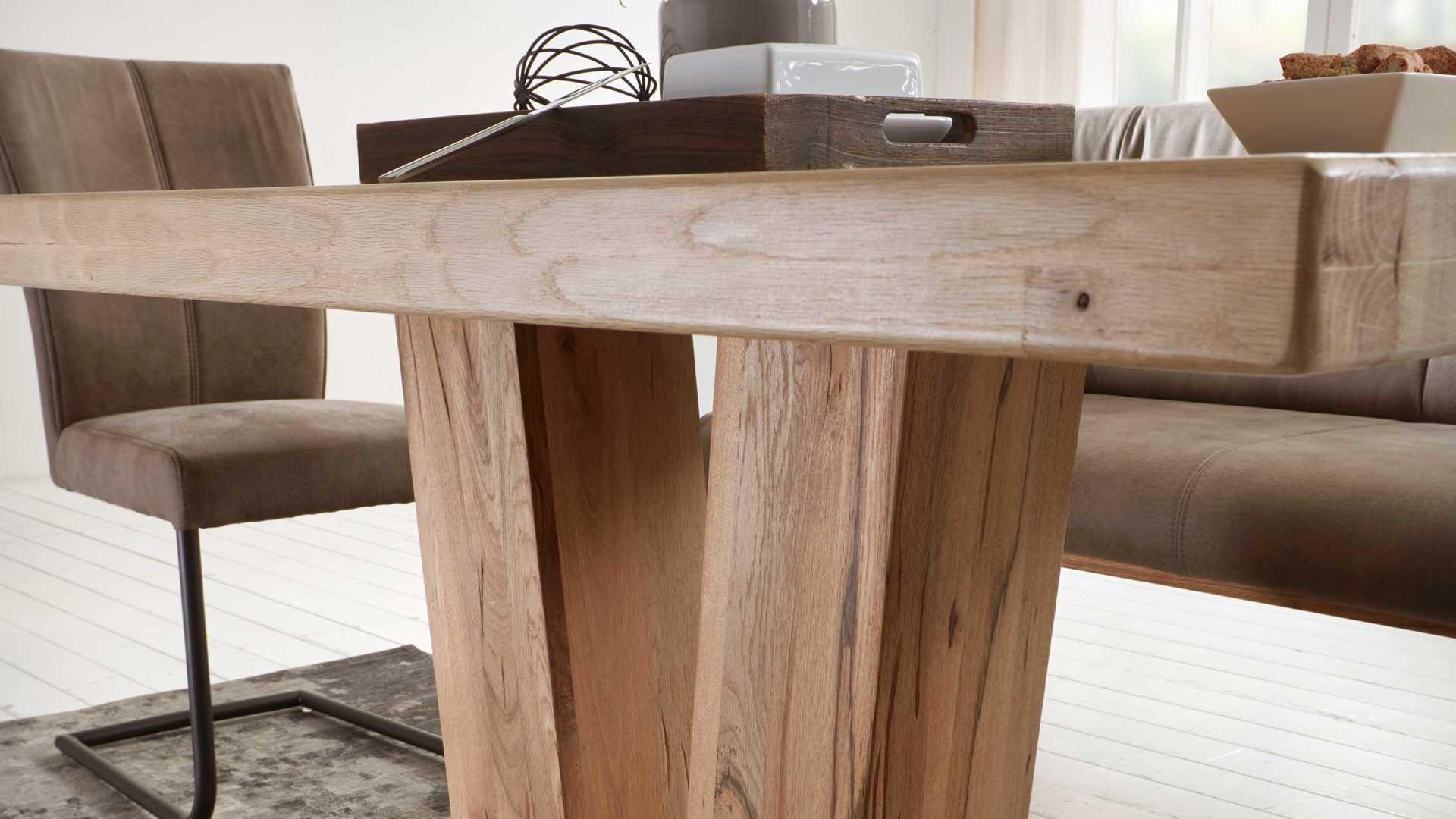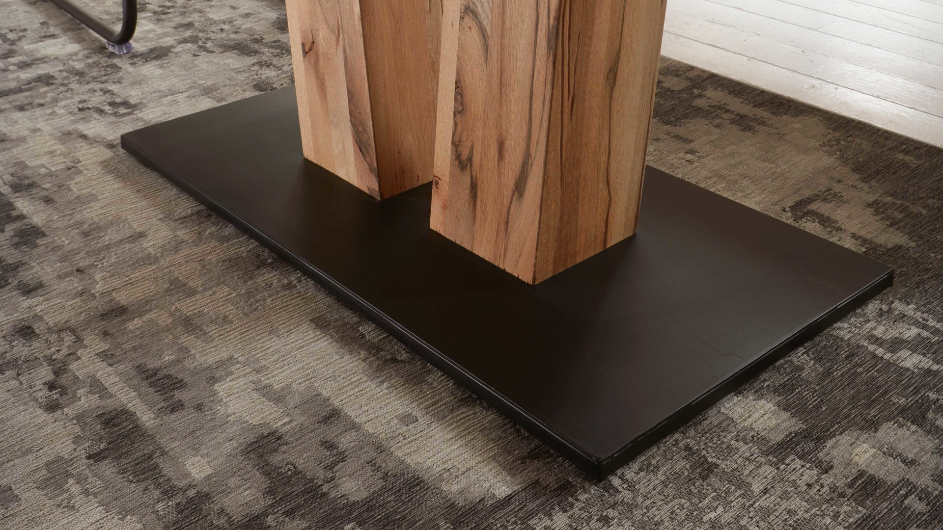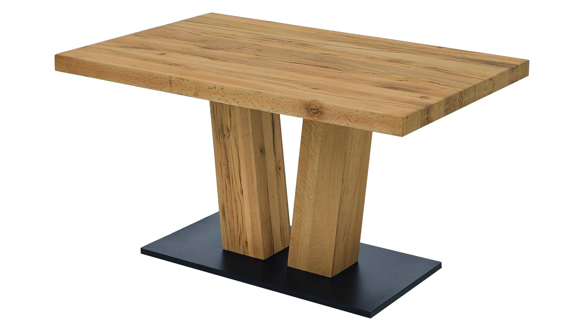 Als stabilisierende Basis fungiert eine schwarz pulverbeschichtete Eisen-Bodenplatte. Durch die strukturgehobelte Balkeneiche mit naturfarbener Wachseffekt-Oberfläche, die Tischplatte und Tischbeine ziert, bringt der Holztisch eine wunderbar warme, einladende Ausstrahlung in jeden Raum.