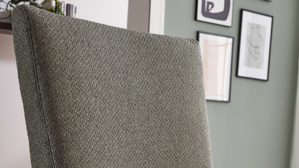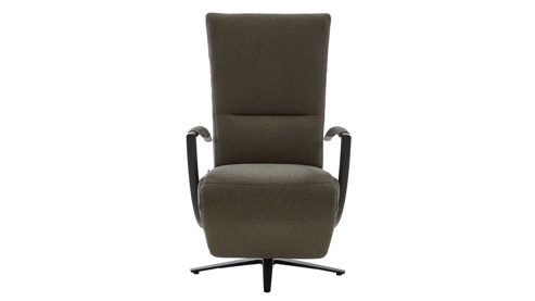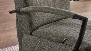 olivfarbener Flachgewebebezug, kombiniert mit einem mattschwarzen Metall-Sternfuß und Metall-Armlehnen