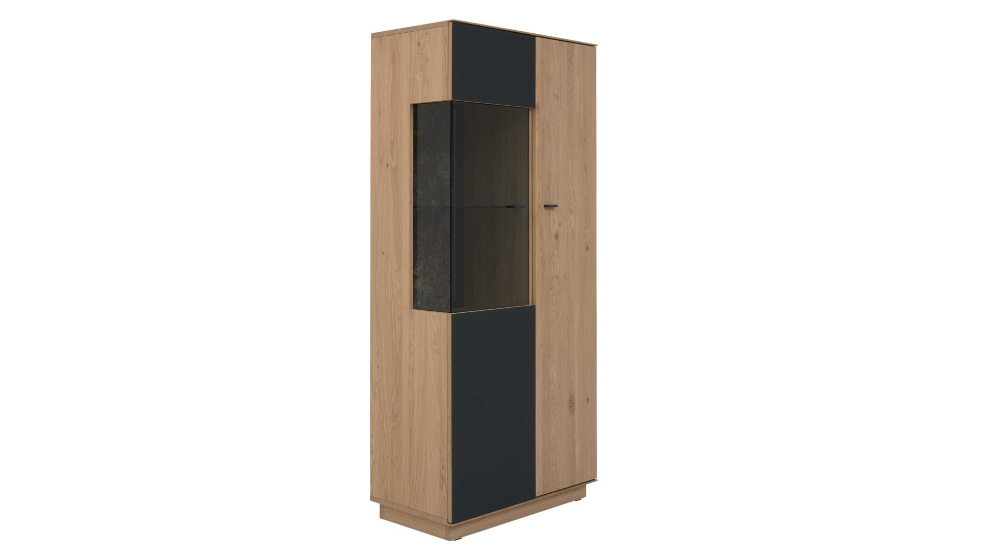 Die satinmatte Parsolglasfläche in Anthrazit und die Kork-Rückwand schaffen einen spannenden Kontrast zur natürlichen Holzstruktur und verleihen der Vitrine eine moderne Leichtigkeit. Anthrazitfarben lackierte Metallgriffe mit Feinstruktur fügen sich harmonisch in das elegante Erscheinungsbild ein und sorgen für eine angenehme Haptik.