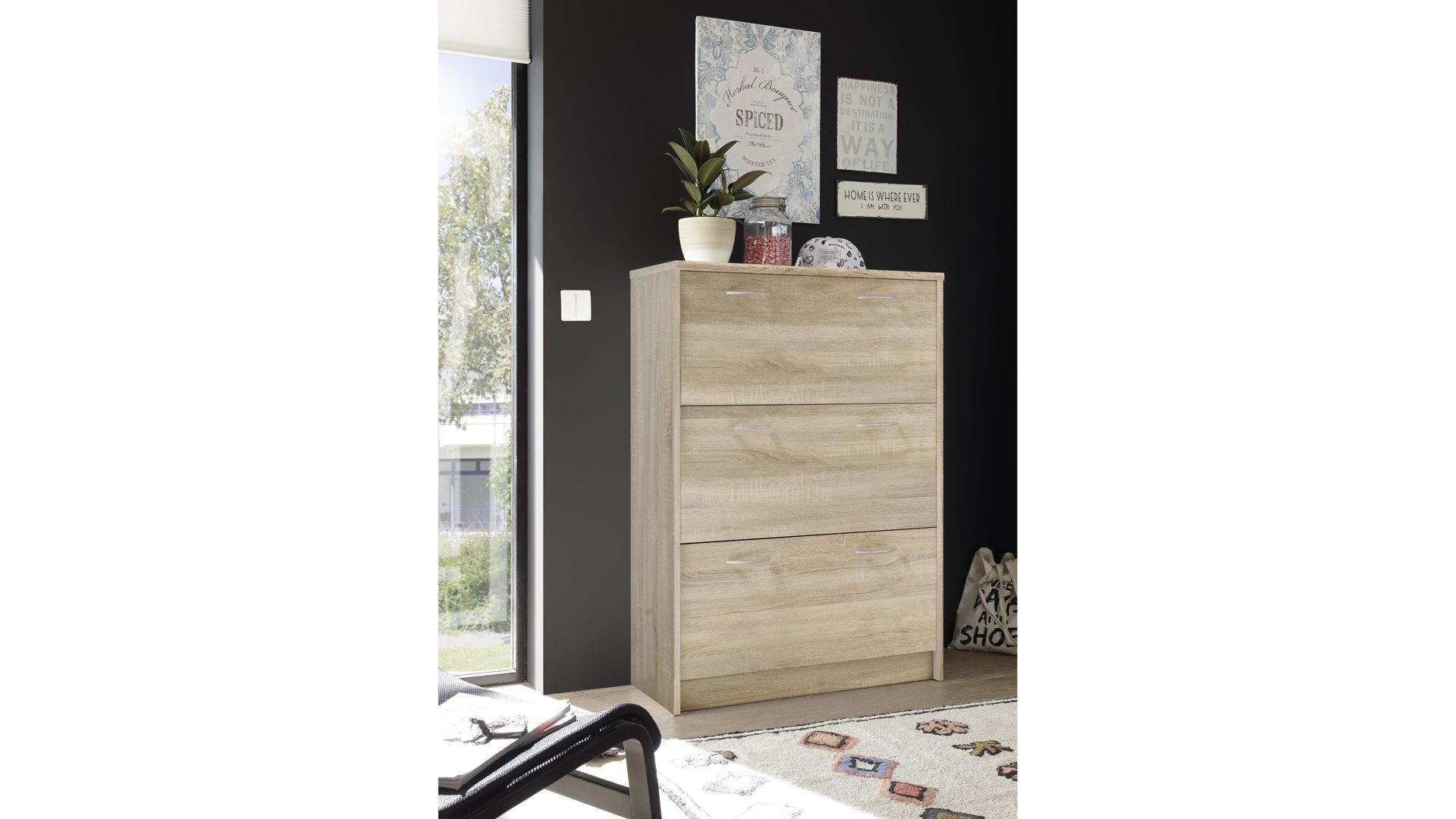Der Schuhkipper Optimus ist enorm stilvoll designt und ausgesprochen praktisch. Mit den Sonoma eichefarbenen Kunststoffoberflächen bringt der Schuhschrank moderne Eleganz gepaart mit natürlichem Charme in den Raum, in dem Sie ihn platzieren. Akzente setzen die alufarbenen Griffe - sie heben sich einerseits ab, verbinden sich auf der anderen Seite aber auch perfekt mit dem Holzton des attraktiv gestalteten Korpus.