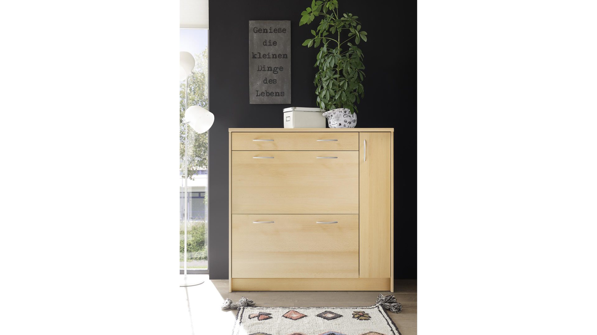 Neben den optischen Vorzügen bieten die Kunststoffoberflächen einen entscheidenden funktionalen Vorteil. Sie sind besonders pflegeleicht, was Ihnen die Reinigung immens erleichtert. Hinter den zwei Klappen der erstklassig verarbeiteten Schuhkommode finden Sie Stauraum für Ihre schönsten Schuhe, die Sie gut geschützt aufbewahren möchten. Überdies beherbergt der Schuhkipper eine Schublade und einen schmalen Türbereich. Diese beiden Elemente verschaffen Ihnen die Möglichkeit, ergänzende Utensilien wie Schuhbürsten, Schuhputzmittel, Schuhlöffel und Ähnliches jederzeit griffbereit zu lagern. Gesamt misst der edle Schuhkipper ca. 108 x 108 x 36 cm (BxHxT).