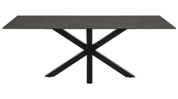 Der Esstisch Heaven kombiniert ein Gestell aus mattschwarz pulverbeschichtetem Metall mit der schwarz marmorierten Keramik-Tischplatte Fairbanks auf einer schwarzen Glasplatte.