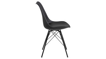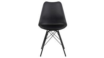 Dieser Polsterstuhl verkörpert schlichte Eleganz. Seine stabile, dabei aber wunderbar filigran designte Basis bildet ein mattschwarz pulverbeschichtetes Stahldrahtgestell. Darauf befindet sich eine schwarze Sitzschale aus robustem Kunststoff. Sie ist mit schwarzem Kunstleder bezogen, das sowohl qualitativ als auch optisch und haptisch überzeugt. Die Farbgebung sorgt für eine klassische Ausstrahlung.