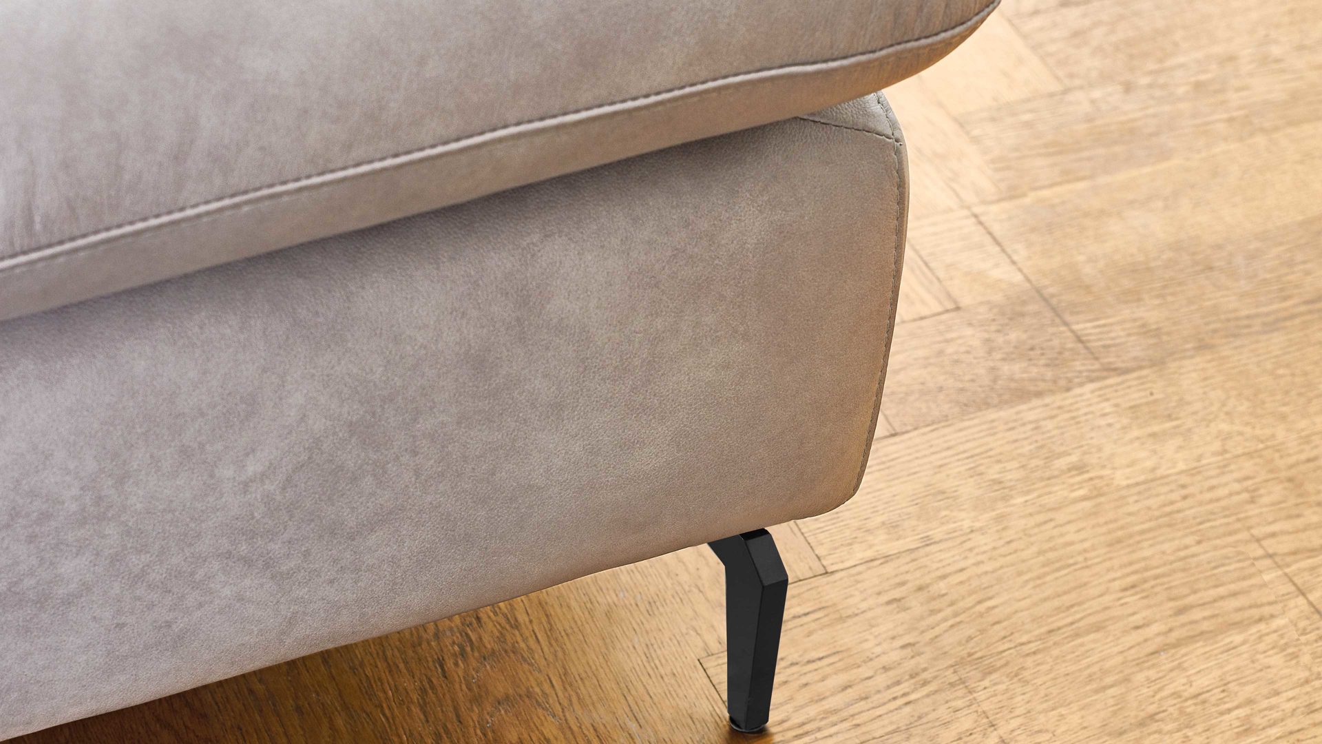 Der Hocker aus der W.SCHILLIG Polsterserie Select Venus plus kombiniert einen edlen hellgrauen Lederbezug mit mattschwarz pulverbeschichteten Metallfüßen. Seine Maße belaufen sich auf ca. 120 x 46 x 60 (L/xHxT).
