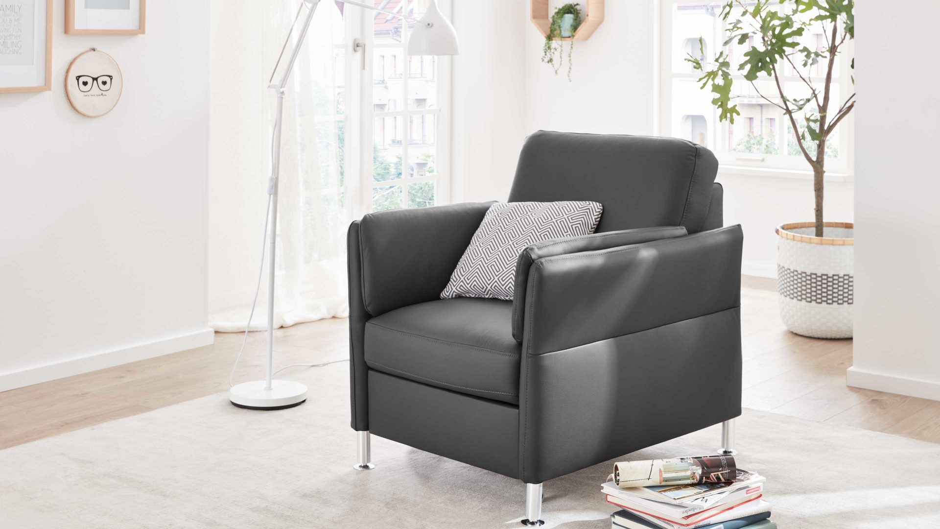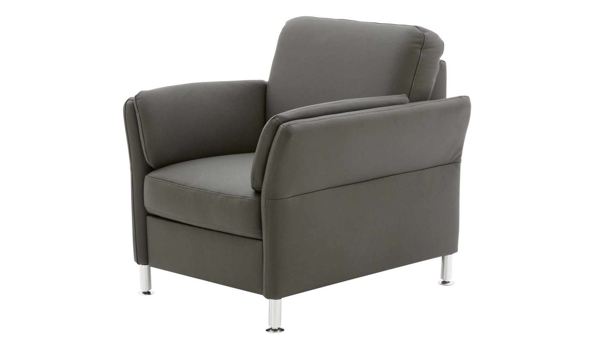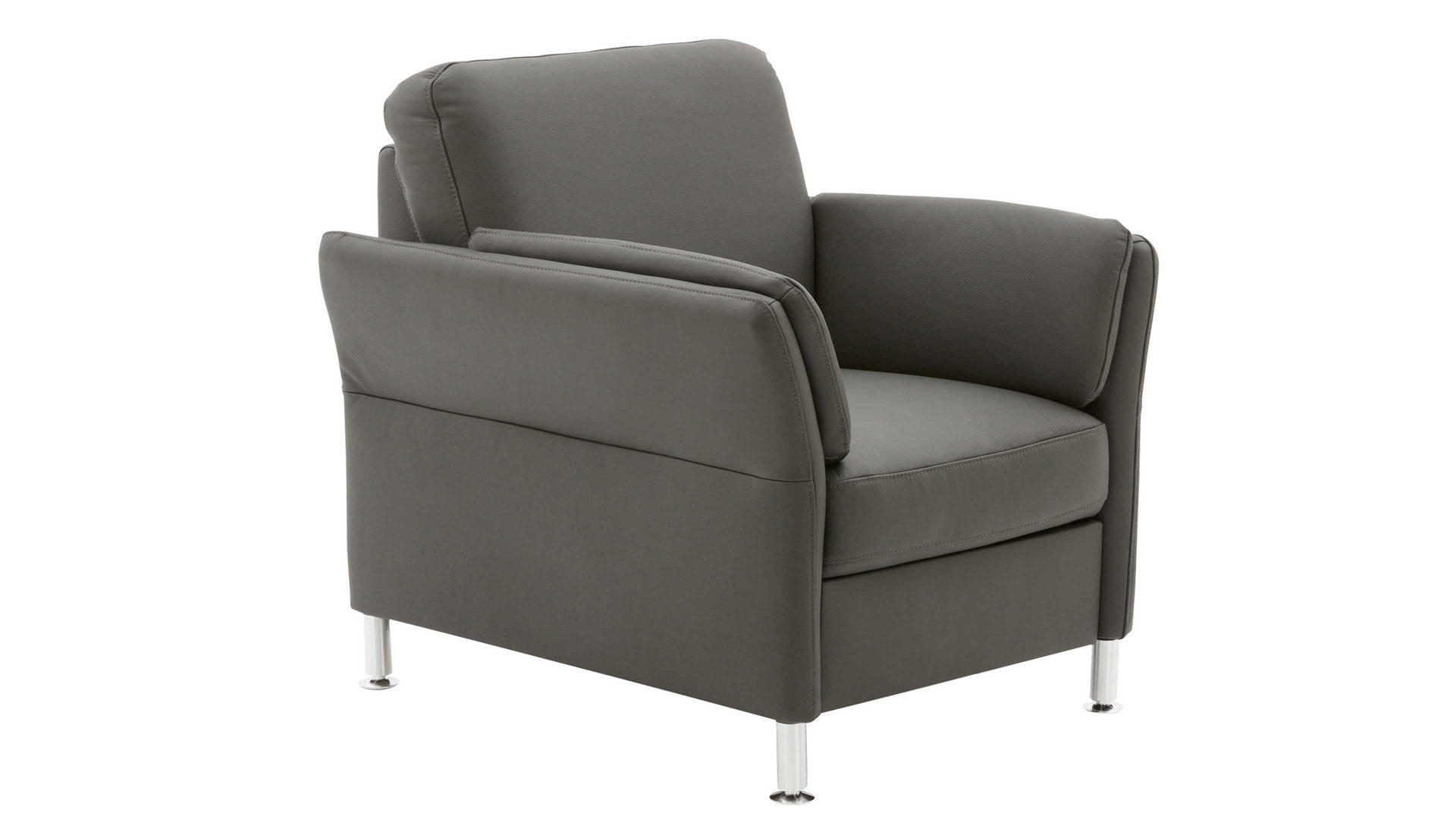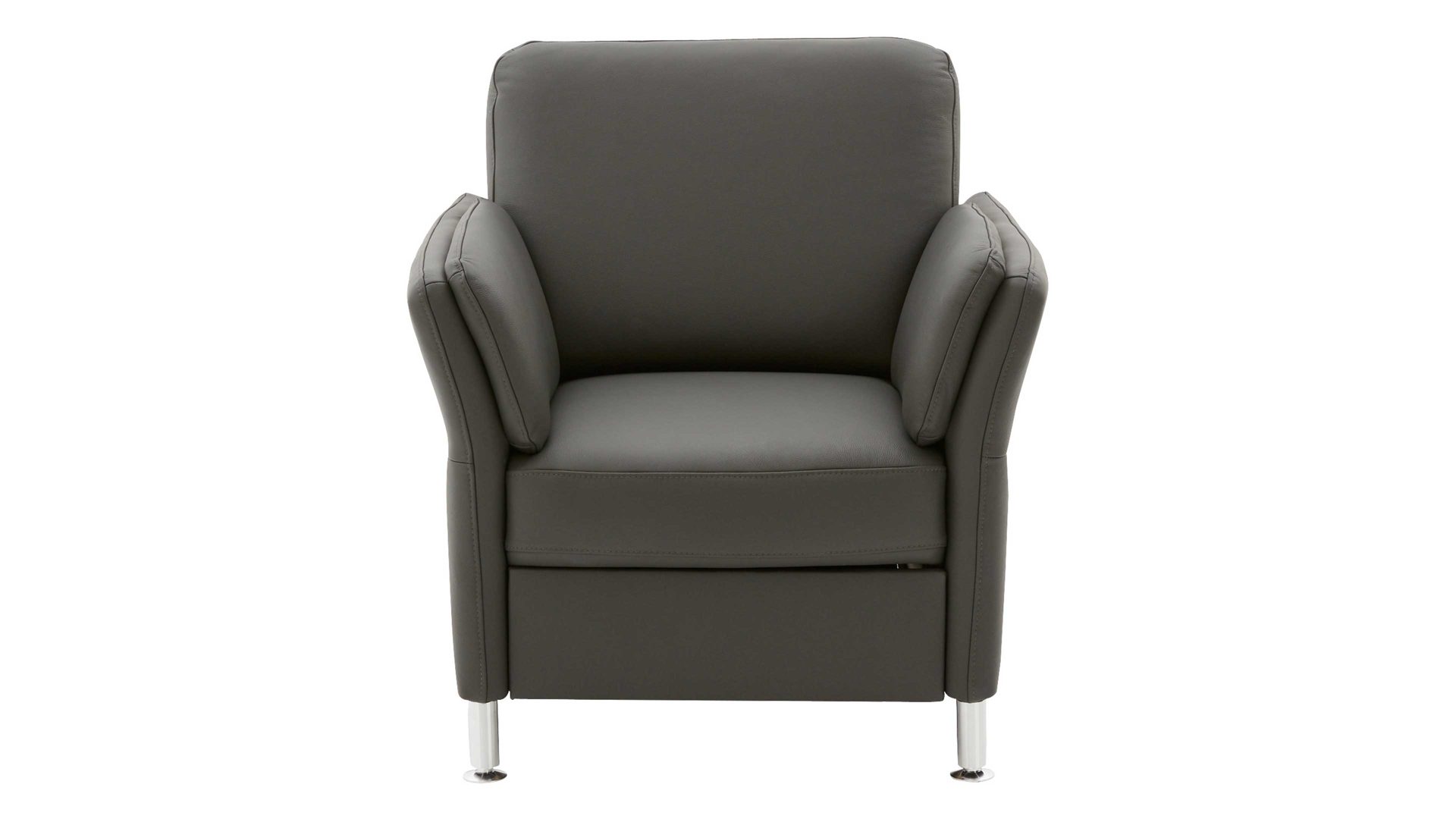 Der Modulmaster Sessel MM-PN1080 kombiniert schlichte alufarbene Metallfüße mit einem anthrazitfarben pigmentierten Lederbezug sowie stoffbezogenen Rücken im selben Farbton.