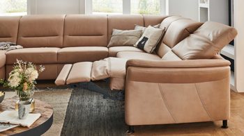 Das Programm bietet eine beeindruckende Typen- und Bezugvielfalt, wobei alle Rückseiten im Originalstoff bezogen sind und die Bezüge wahlweise mit oder ohne Kontrastnaht umgesetzt werden können. Überdies stehen sieben Fußvarianten, zwei preisgleiche Sitzhöhen und mit Kaltschaum, Federkern und - gegen Aufpreis - Boxspring drei Sitzqualitäten zur Wahl.