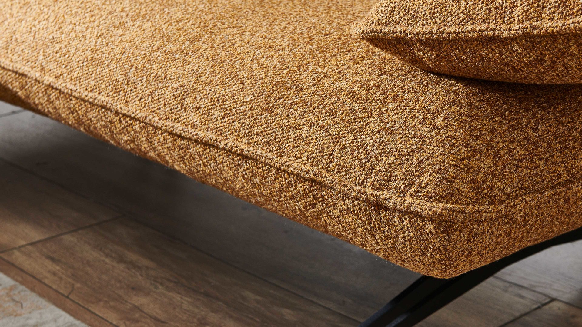Mit seinen mattschwarzen Metallkufen verleiht es jedem Raum eine moderne und stilvolle Note. Es besteht aus einer schrägen mittelgroßen Liege mit Armteil links und einem mittelgroßen Element Armteil rechts.