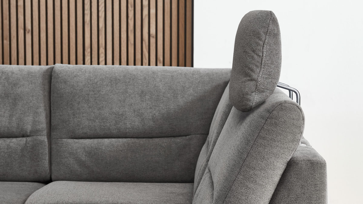 die Kopfstütze wird in die Kopfstützenvorrichtung an der Rückenlehne des Sofas eingesteckt und lässt sich dann in der Höhe und in der Neigung manuell verstellen