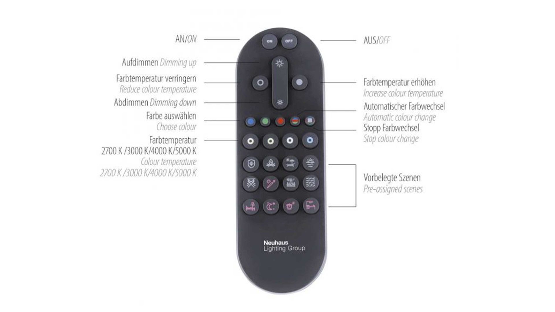 | Verstellbarkeit und Funktion: | dimmbar Fernbedienung CCT | Lichtmanagement Memoryfunktion Farbwechsler | |