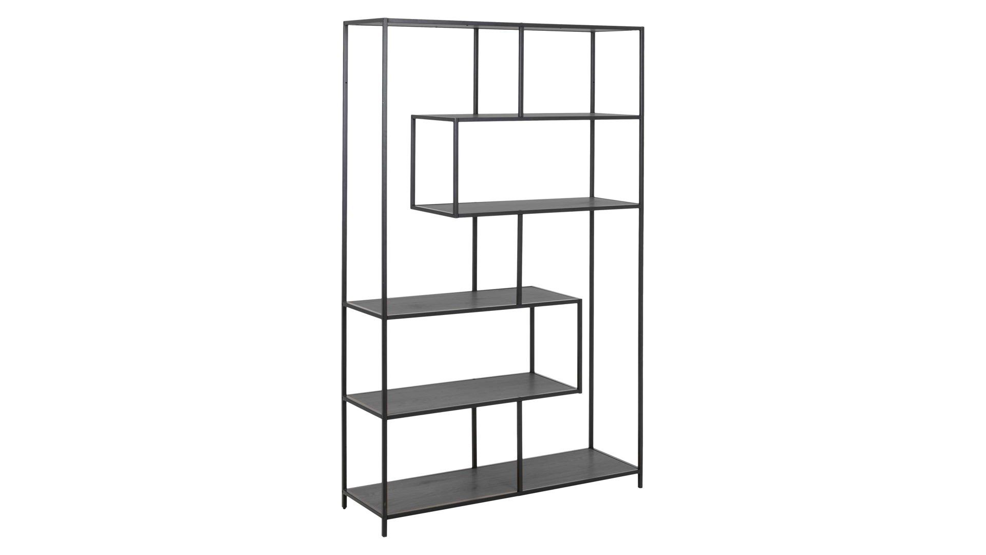 Die Regalböden in schwarzer Esche-Nachbildung verleihen dem Standregal ein modernes Aussehen. Sein schwarz pulverbeschichtetes Stahlgestell mit rauer Oberfläche rundet das auffällige Design des Wohnzimmermöbels optimal ab. Auf zwei großzügigen Böden und in vier verschieden großen Fächern findet alles Platz, was Sie immer im Blick haben möchten.