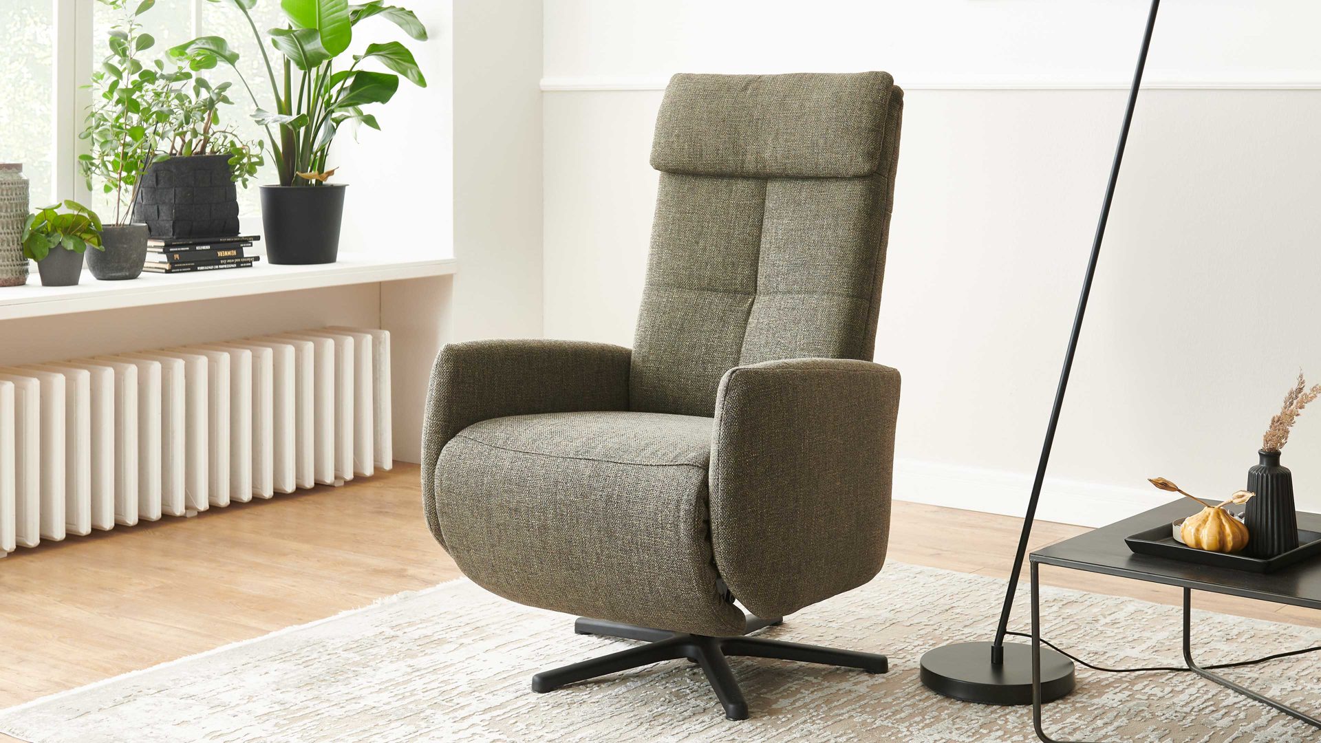 Dieser Relax-Drehsessel aus dem Polsterprogramm New Jersey zeichnet sich durch seine moderne und gemütliche Ausstrahlung, eine exzellente Material- und Verarbeitungsqualität sowie extra hohen Sitzkomfort aus. Der trendige und spezielle olivfarbene Stoffbezug sorgt für ein edles Design. Ein mattschwarzer Metall-Sternfuß rundet die Optik stimmig ab und trägt überdies zur Stabilität des attraktiven TV-Sessels bei. Einen gelungenen Akzent setzt die gesteppte Rückenlehne. Die Sitzfläche ist glatt bezogen.