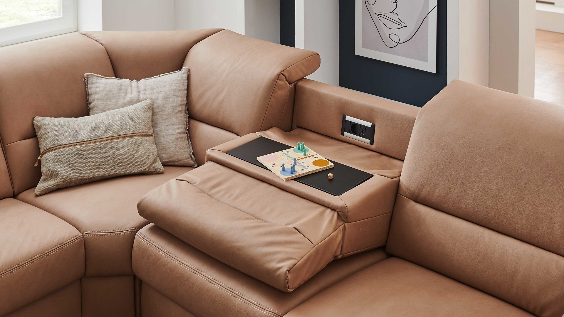 Indem Sie das Rückenpolster kurz mit einem Handgriff nach vorne klappen, offenbaren Sie eine praktische Ablagefläche, auf der Sie etwa bei einem Filmabend Gläser und Snacks platzieren können.